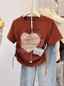 RM18943#夏甜辣风圆领短袖褶皱修身显瘦字母印花百搭T恤上衣女