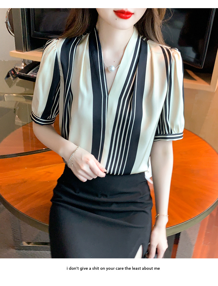 RM19037#夏季新款韩版百搭V领短袖条纹衬衫女上衣送项链