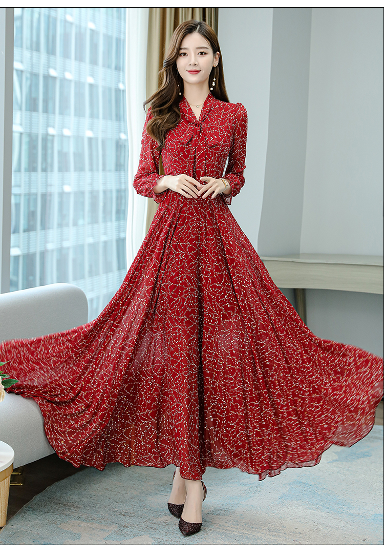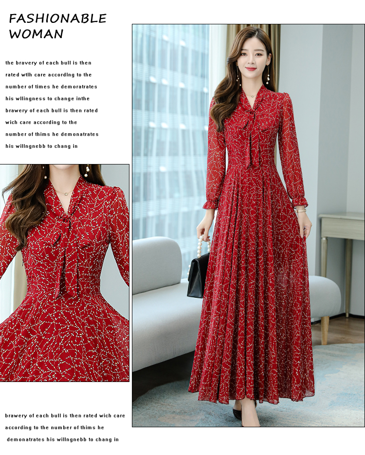 RY1685#气质收腰修身显瘦过膝蝴蝶结V领烫金长裙连衣裙