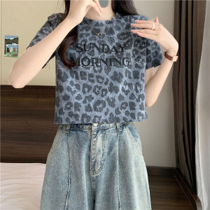RM19105#微胖MM豹纹字母印花辣妹短款T恤