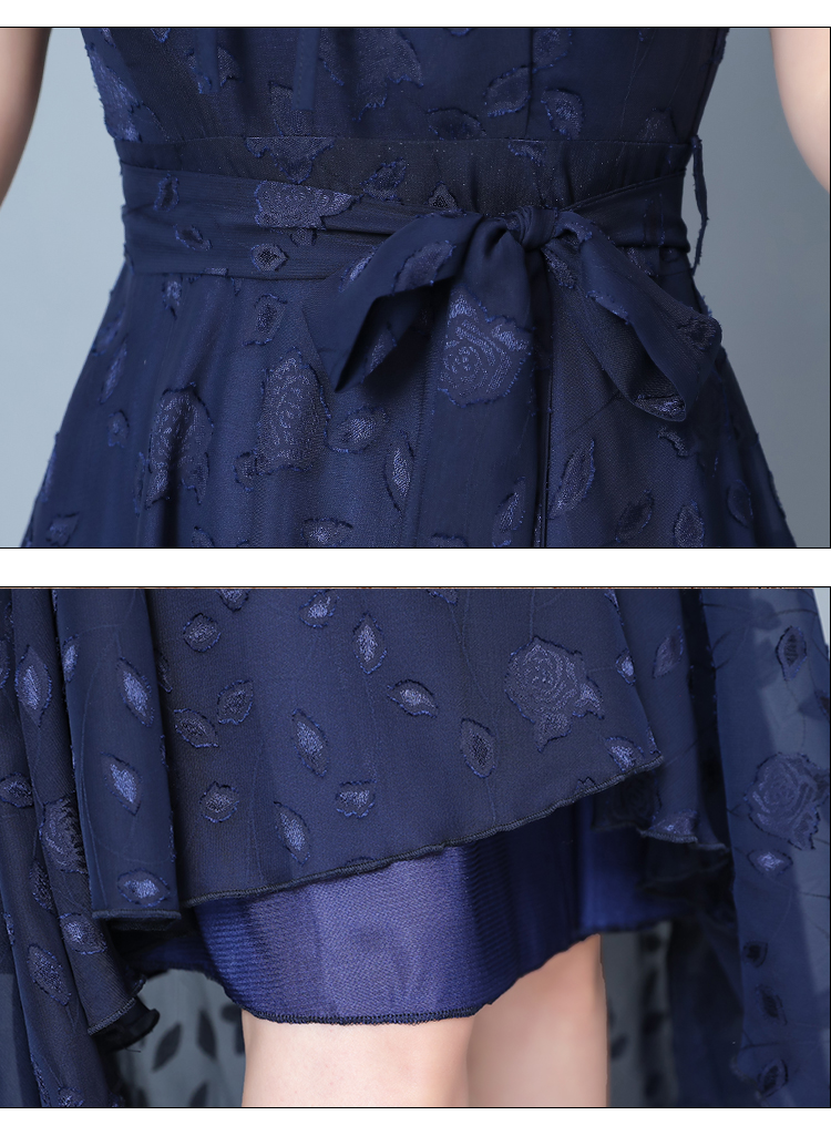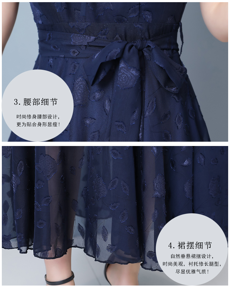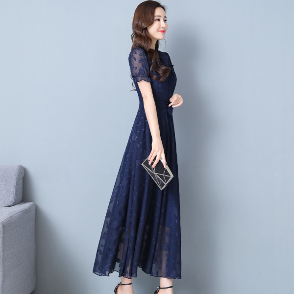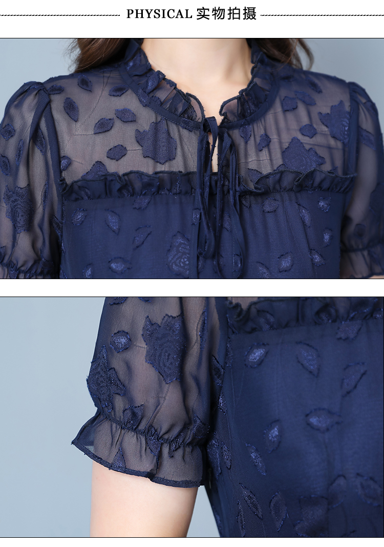 RM19155#夏新款荷叶领修身短袖提花雪纺连衣裙大摆长裙女
