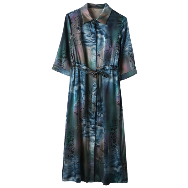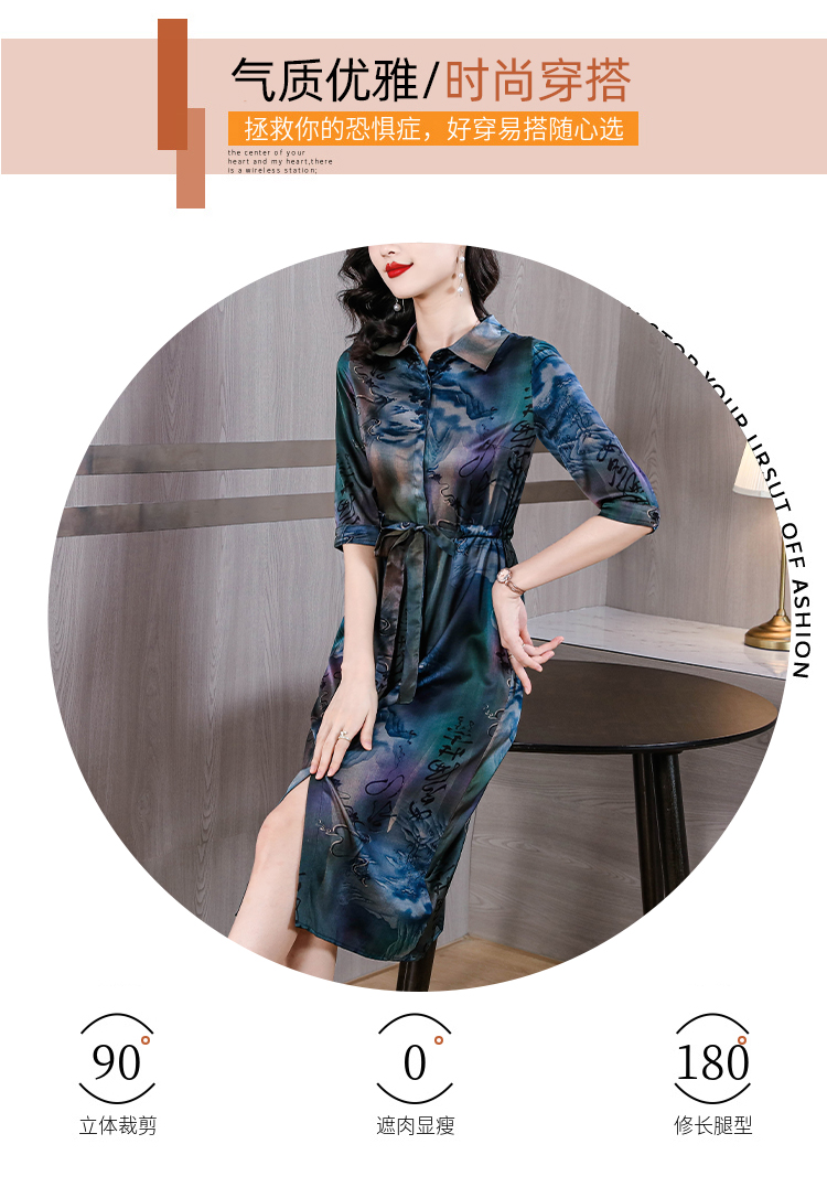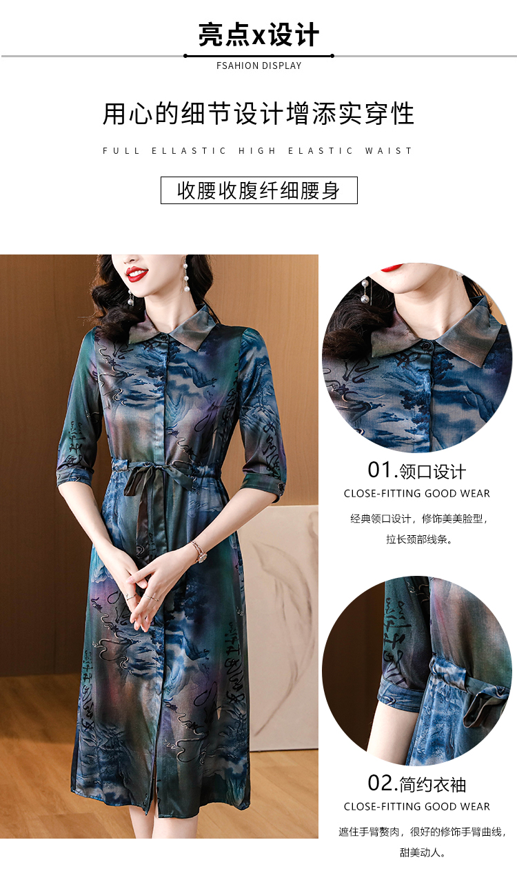 RM19158#醋酸缎面印花七分袖连衣裙2022早秋新款流行长裙大码裙