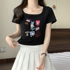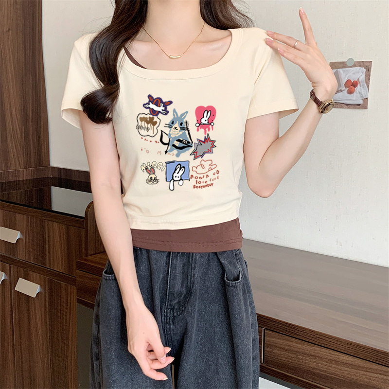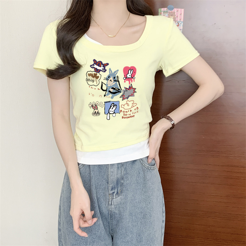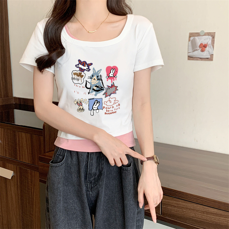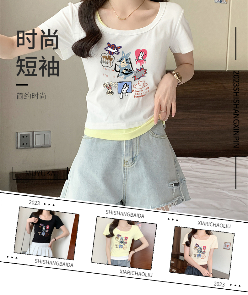 RM19240#设计感方领假两件短袖t恤女装夏季2023新款修身纯欲小众短款上衣