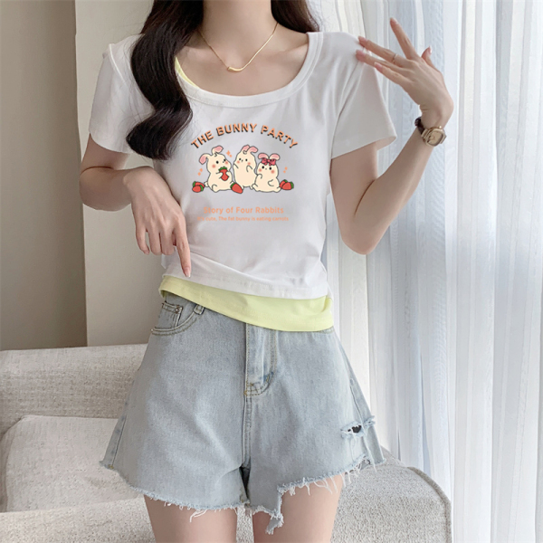 首页 > 女装批发-夏款 > T恤 > RM19241#设计感方领假两件短袖t恤女装夏季2023新款修身纯欲小众短款上衣