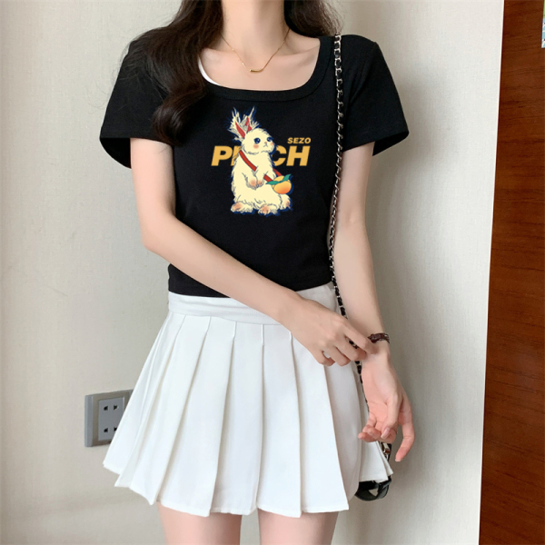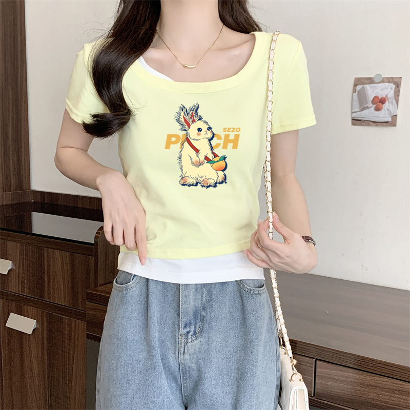 RM19242#撞色拼接短袖t恤女2023夏季新款韩版显瘦方领修身短款假两件上衣