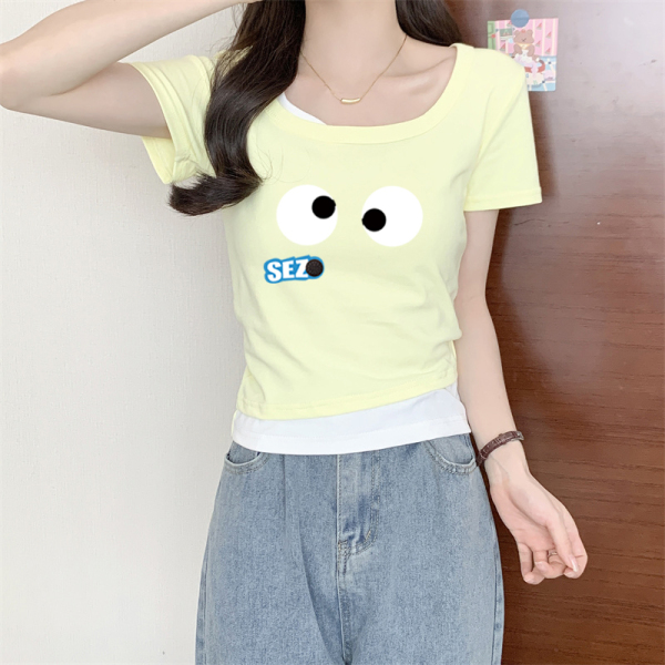 RM19264#假两件撞色方领短袖T恤女夏季新款修身体恤韩系chic别致短款上衣