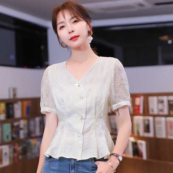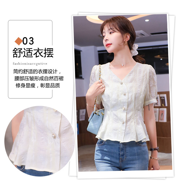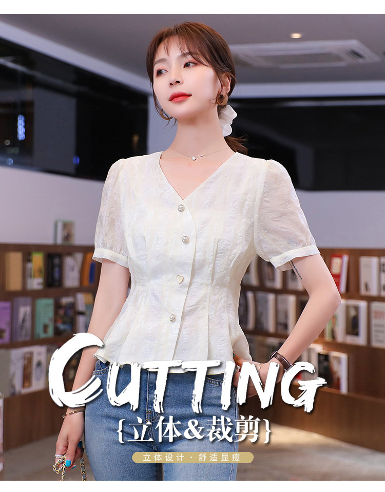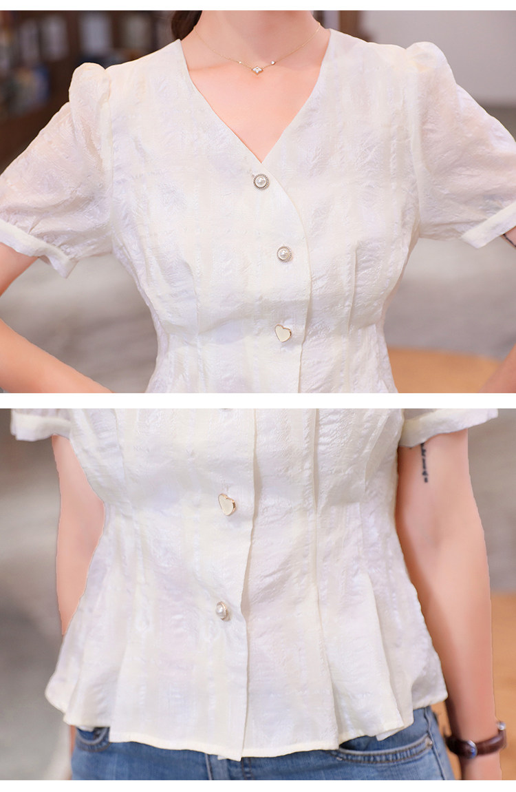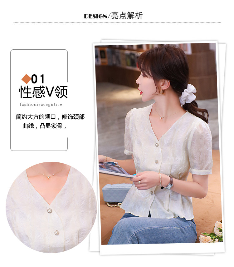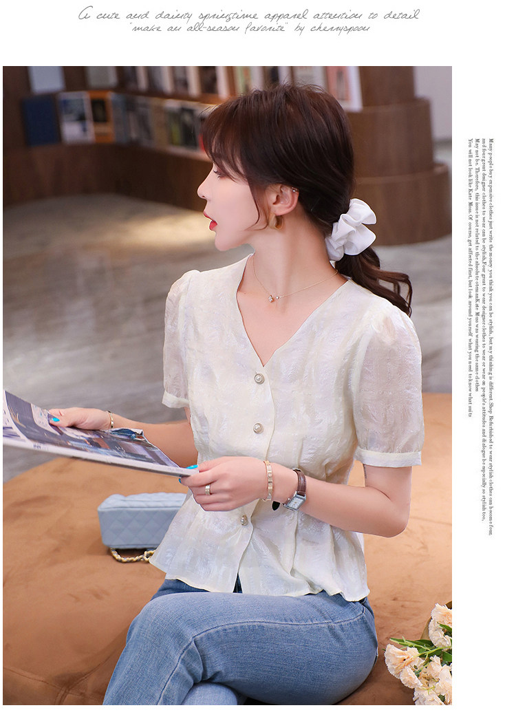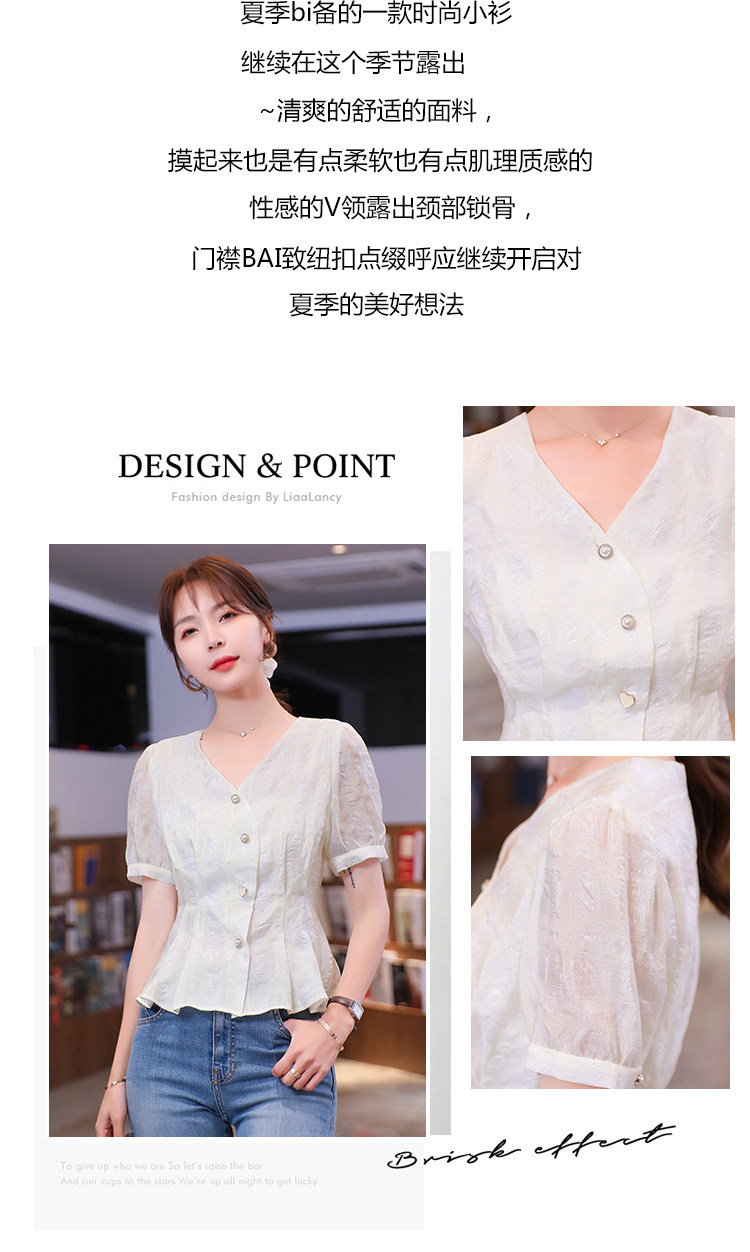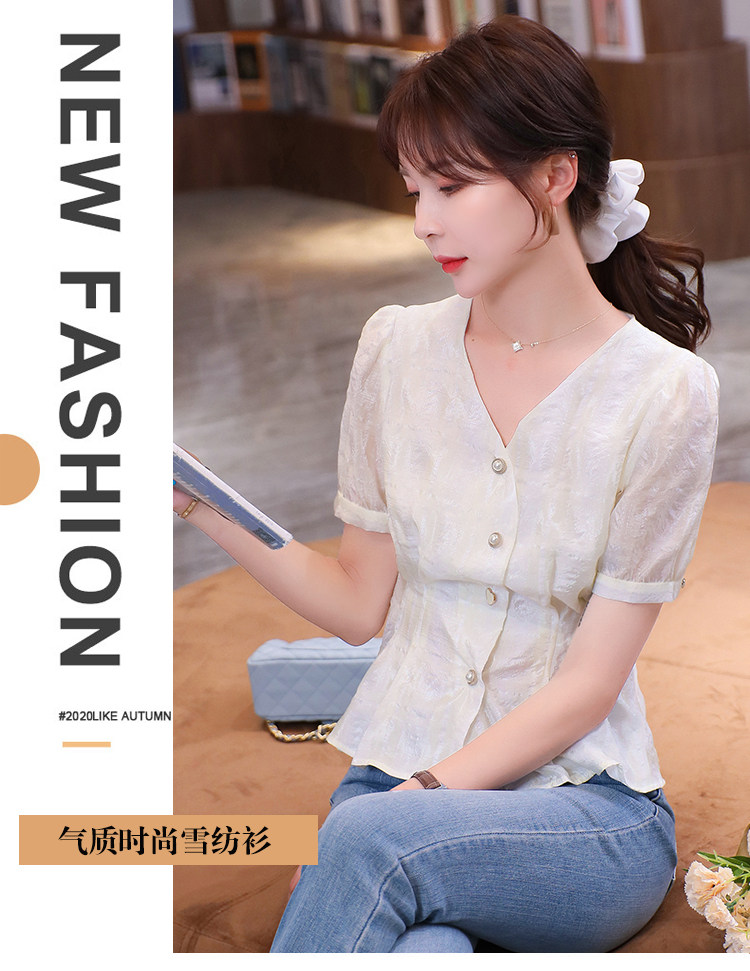 RM19335#夏装新款短袖V领雪纺衬衫女白色网纱衬衣设计感小众上衣