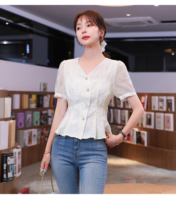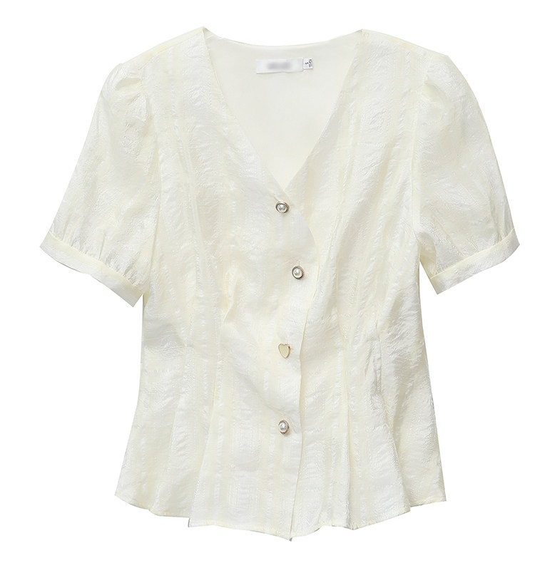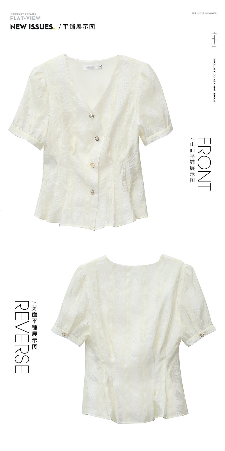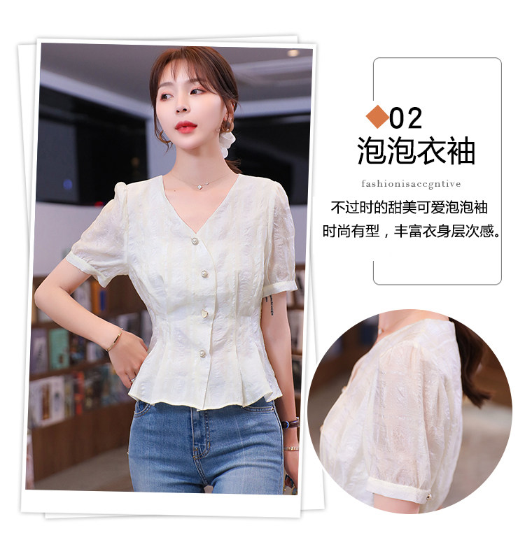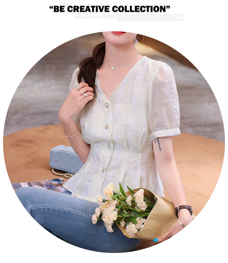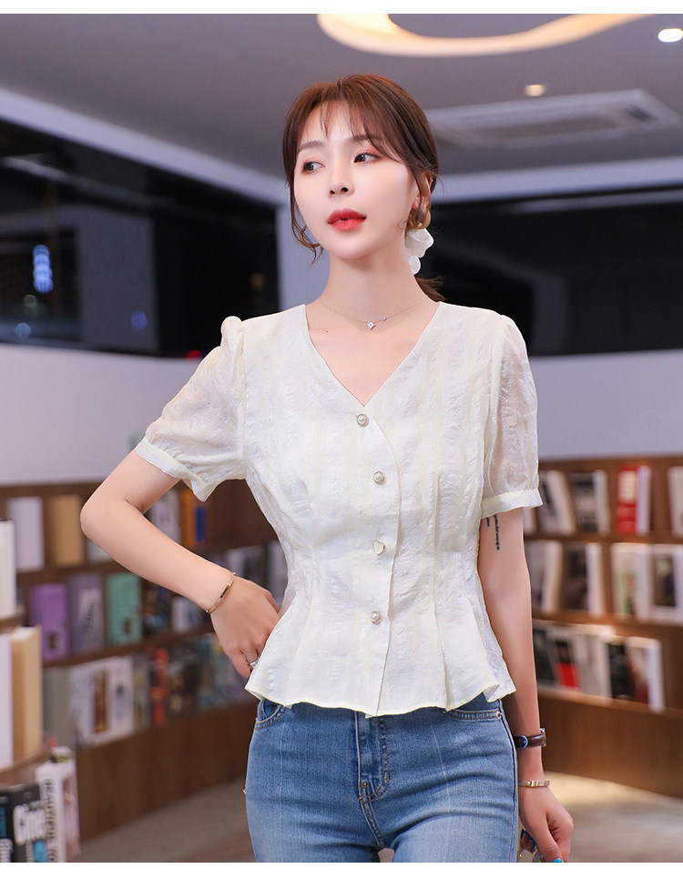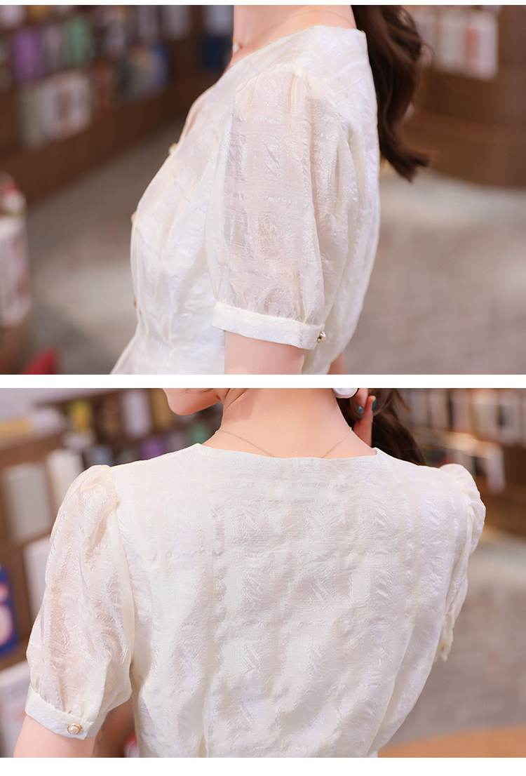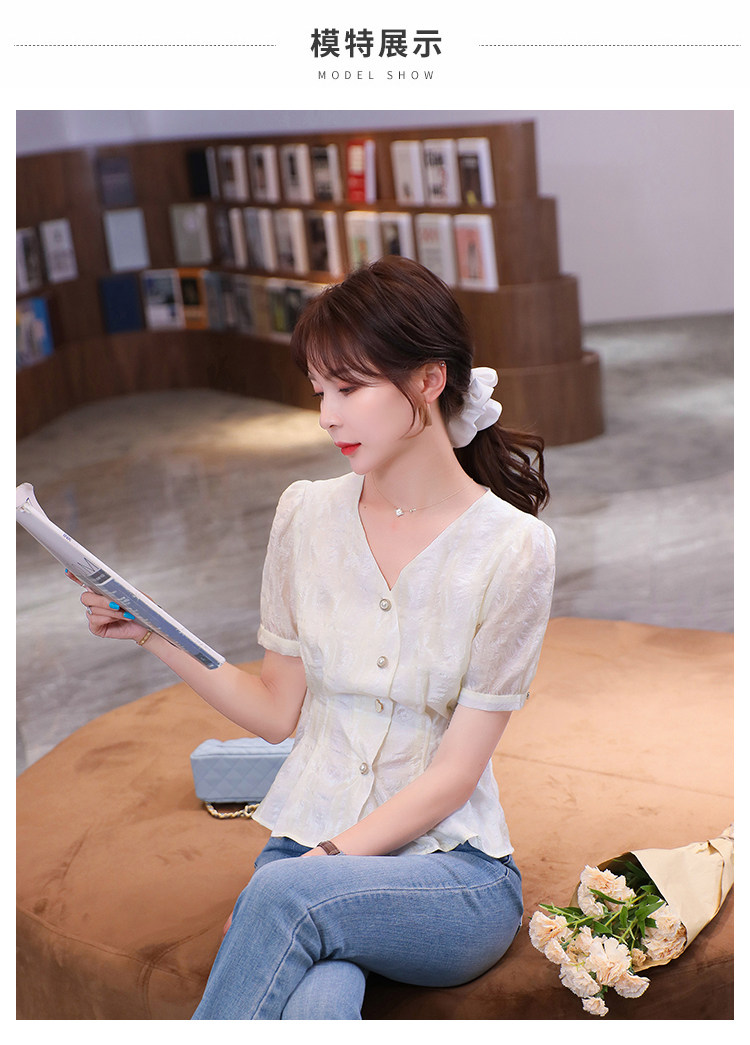RM19335#夏装新款短袖V领雪纺衬衫女白色网纱衬衣设计感小众上衣