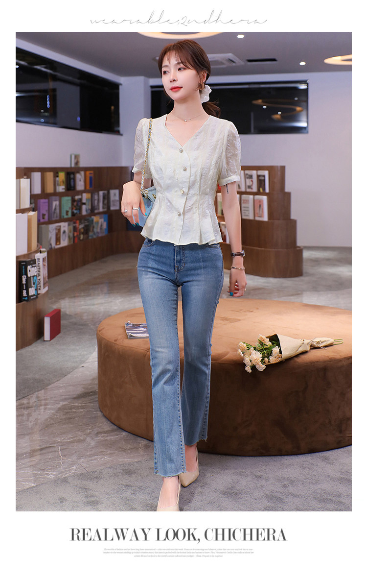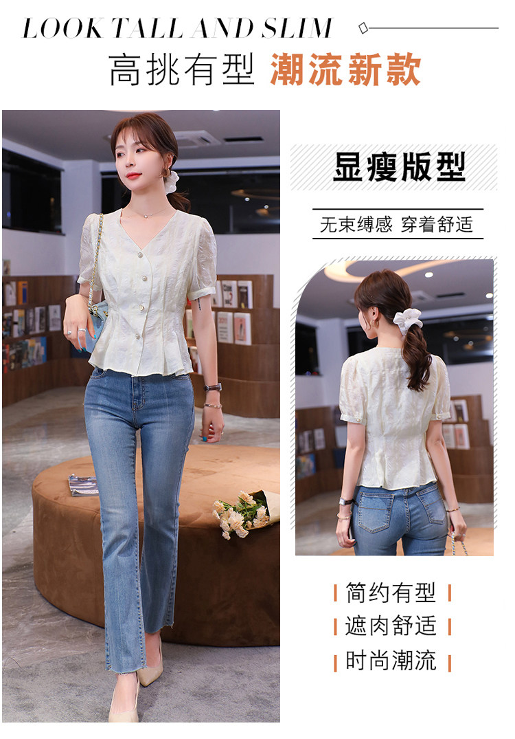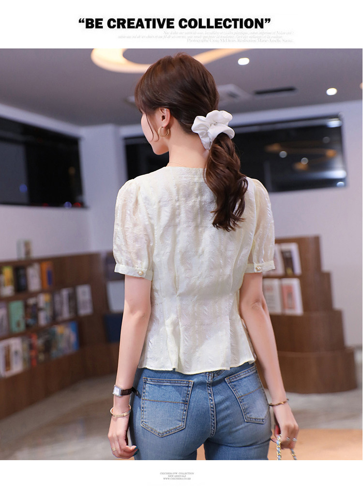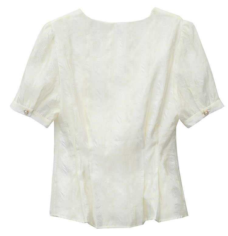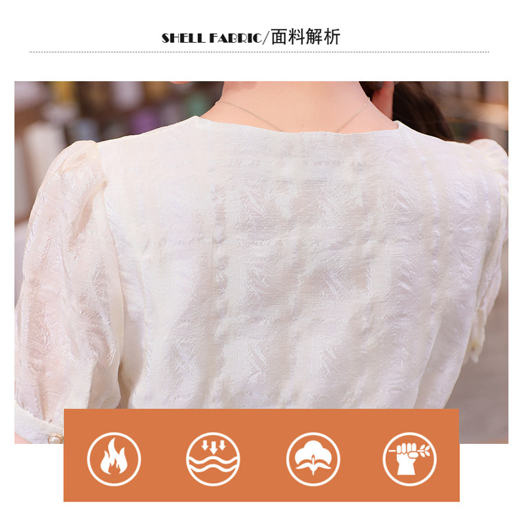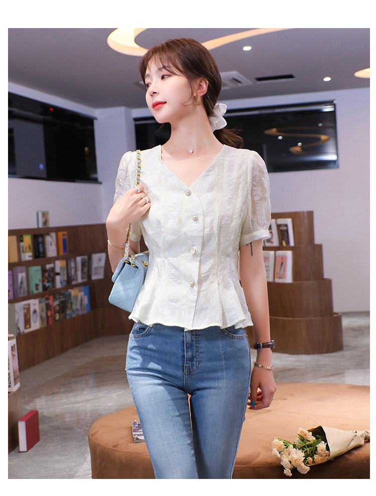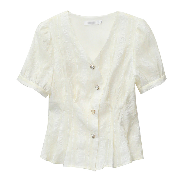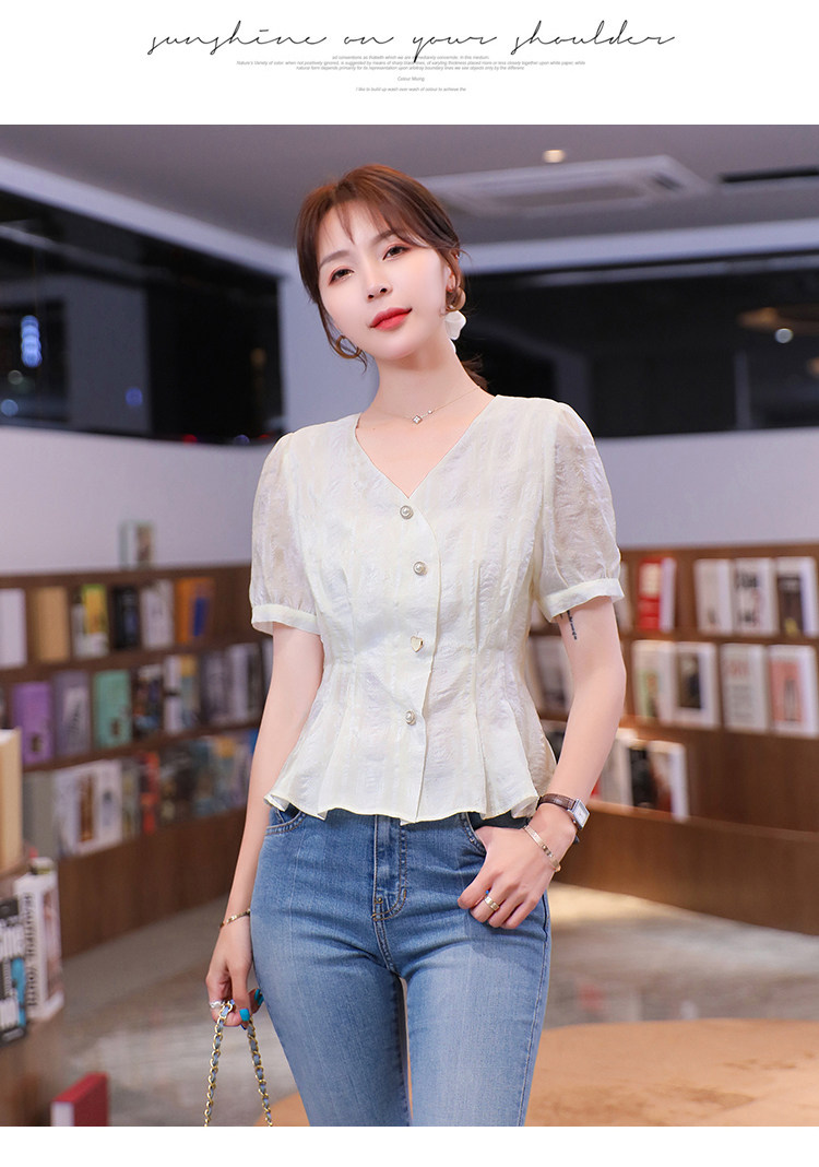 RM19335#夏装新款短袖V领雪纺衬衫女白色网纱衬衣设计感小众上衣