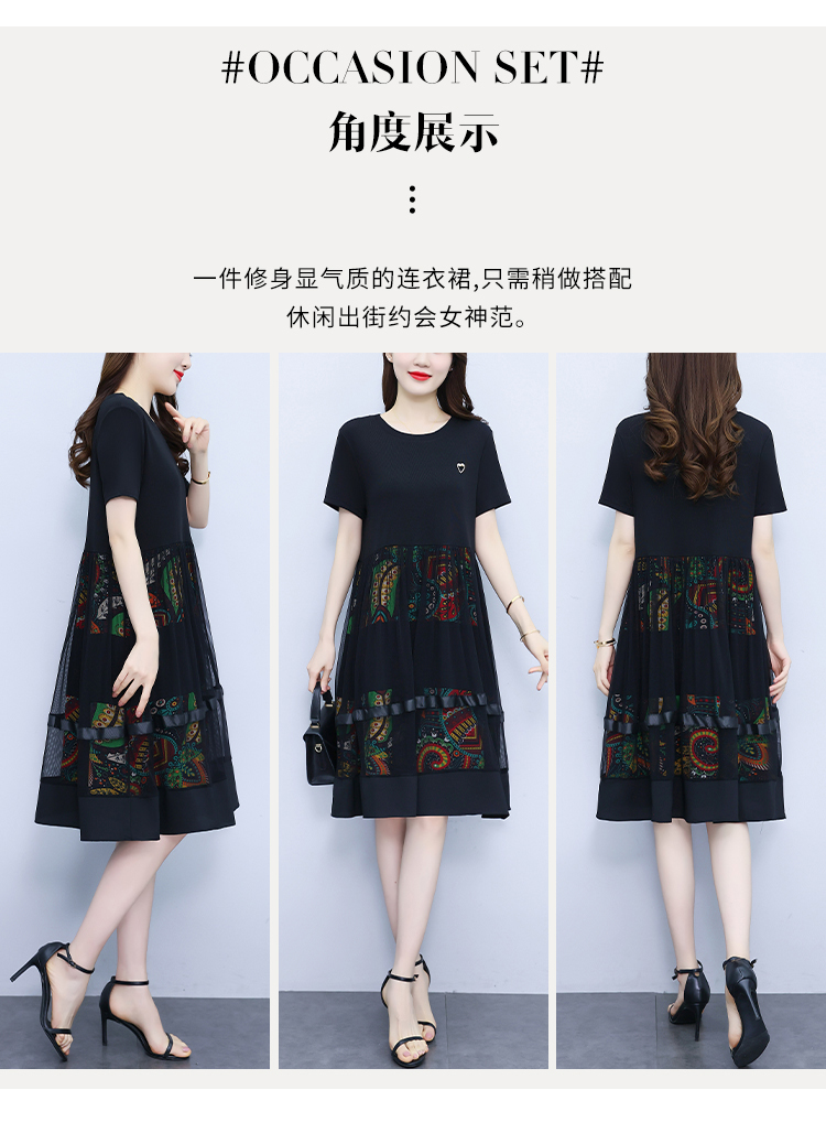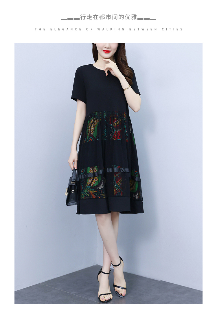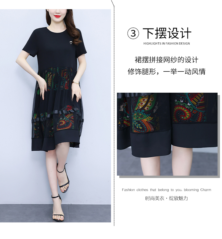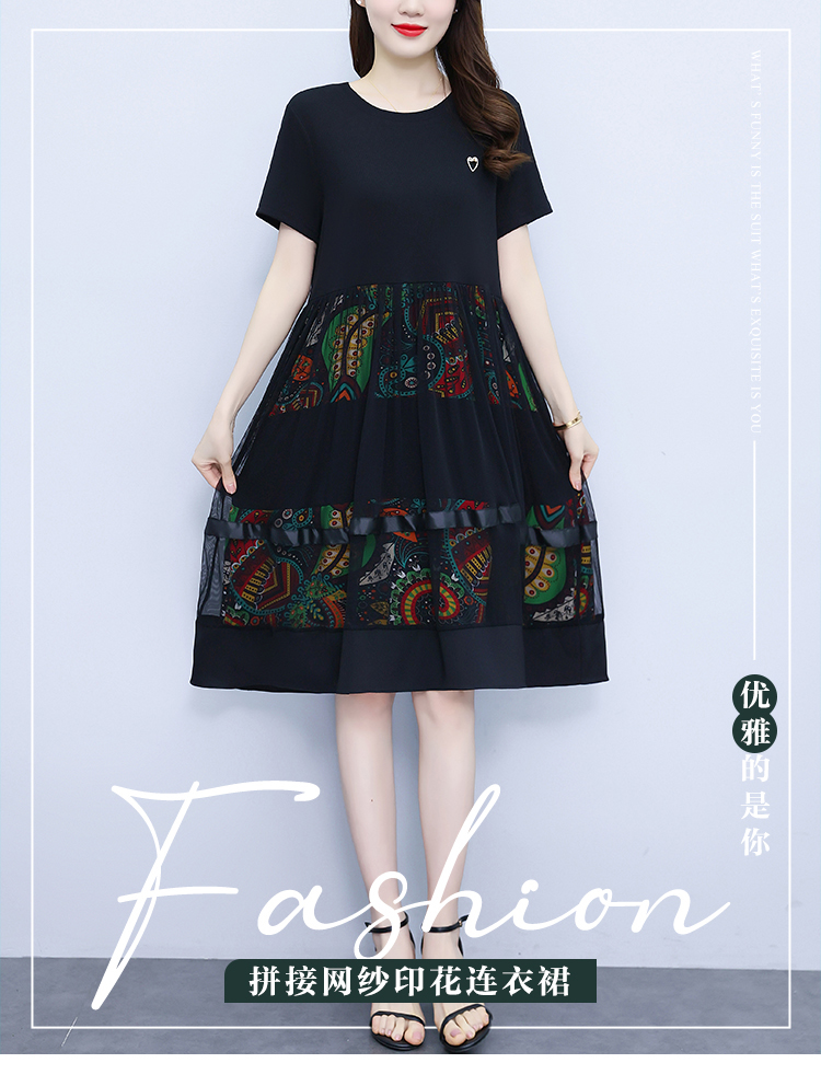 RM19356#夏季新款大码女装妈妈高档印花纱网时尚洋气显瘦连衣裙