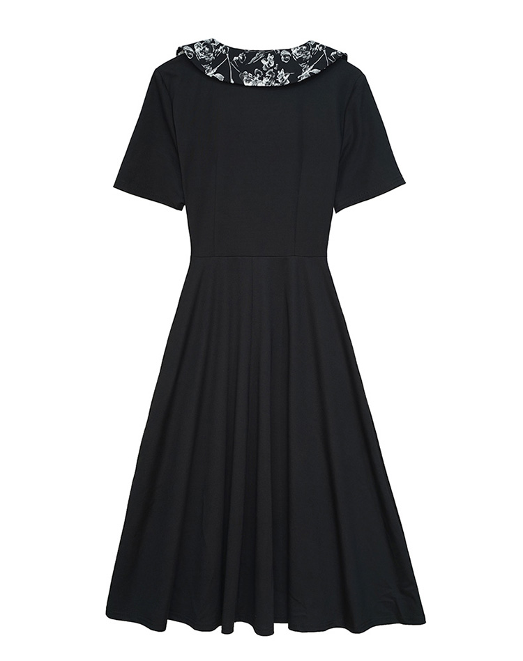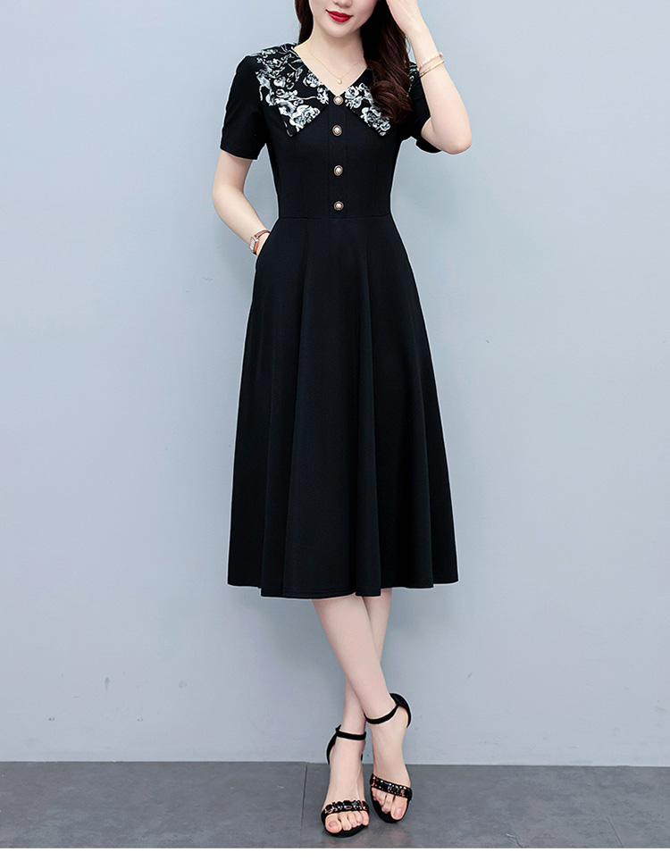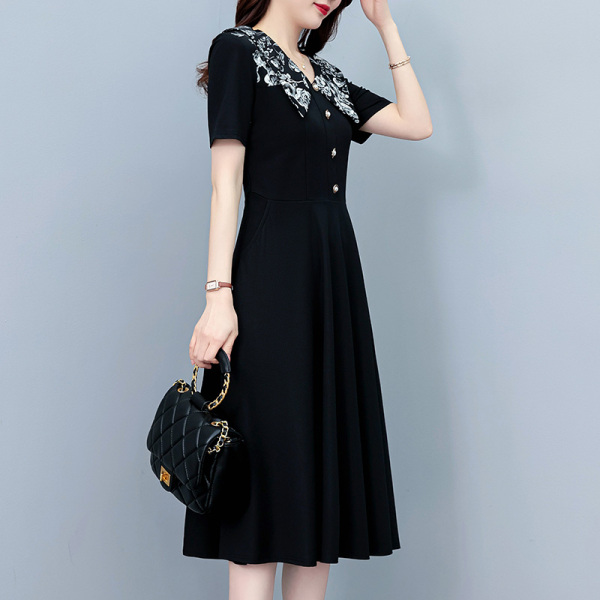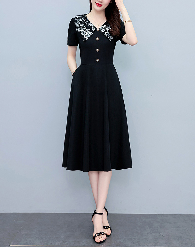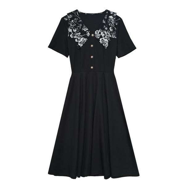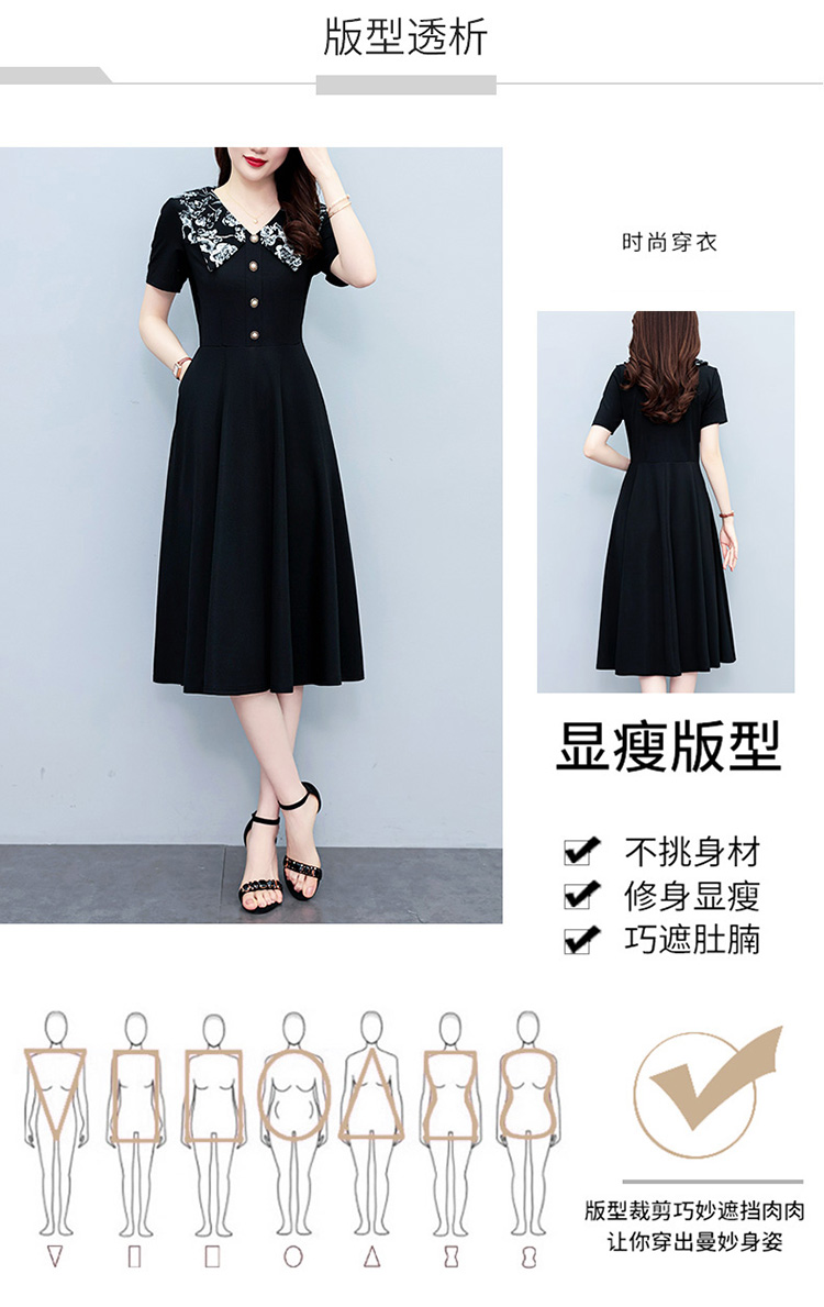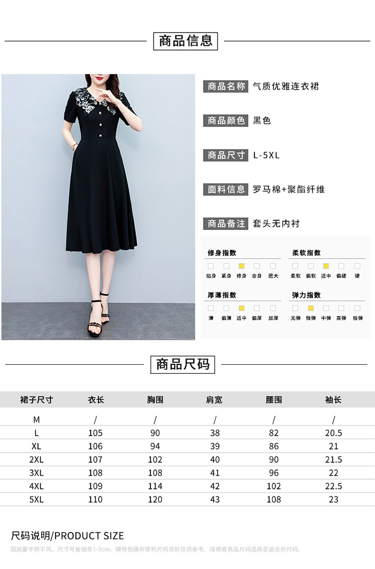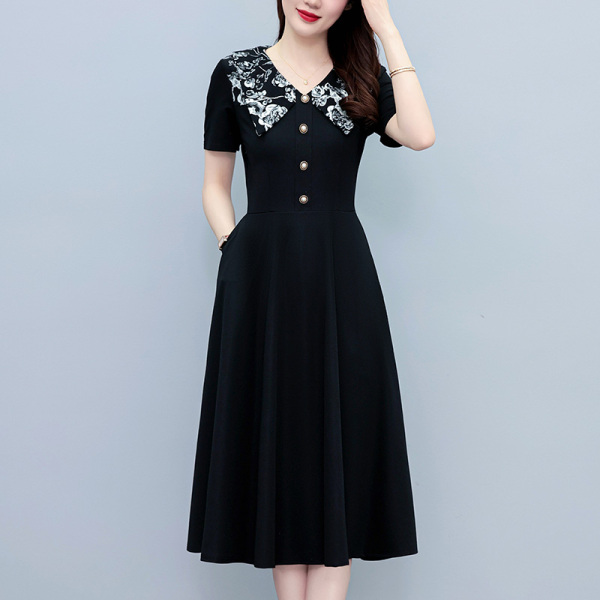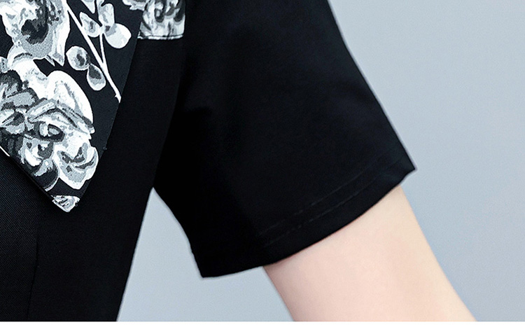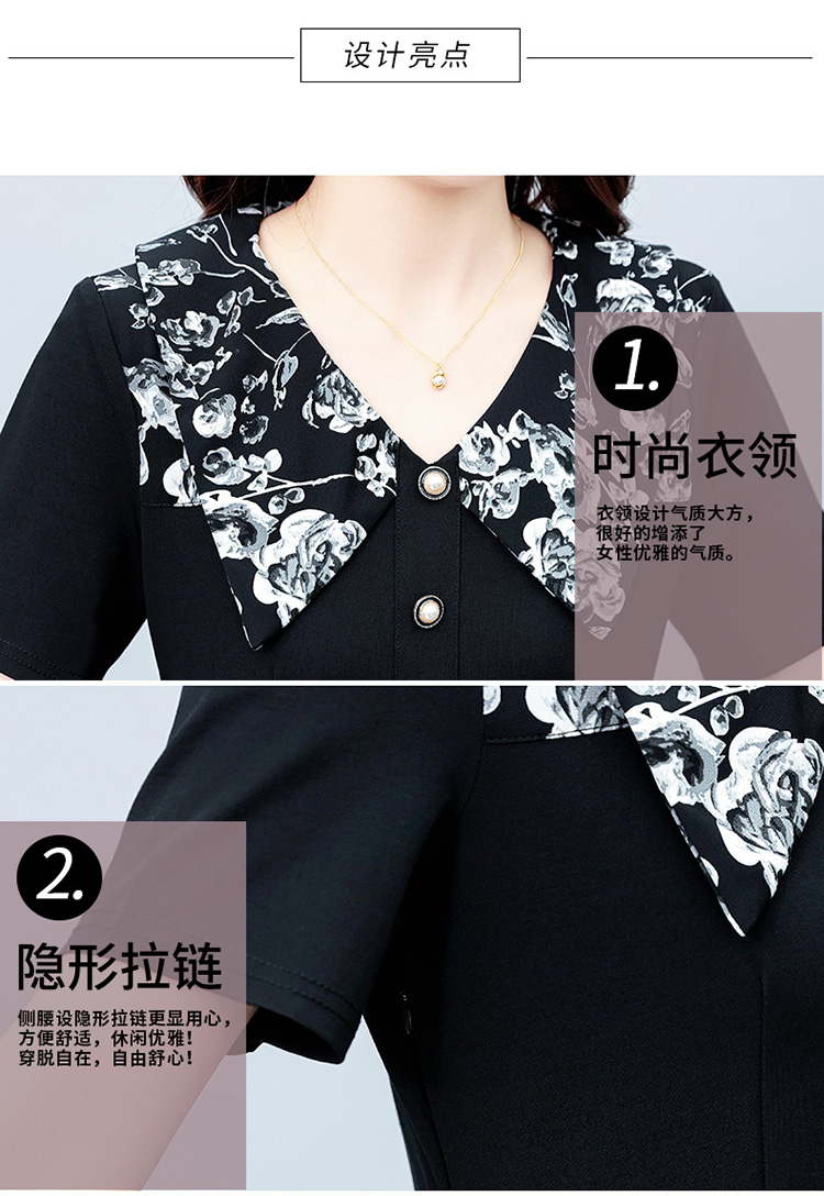 RM19364#黑色印花短袖拼接大码女装胖mm修身中长款夏季新款修身显瘦连衣裙
