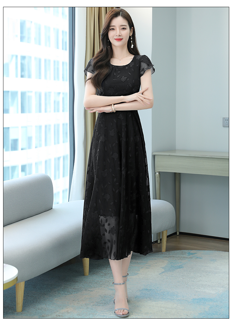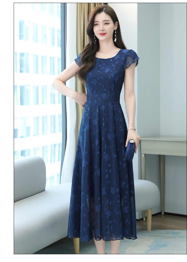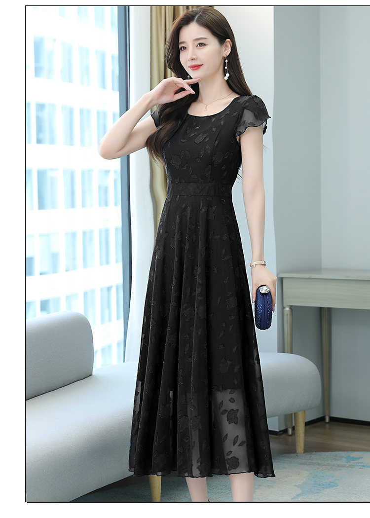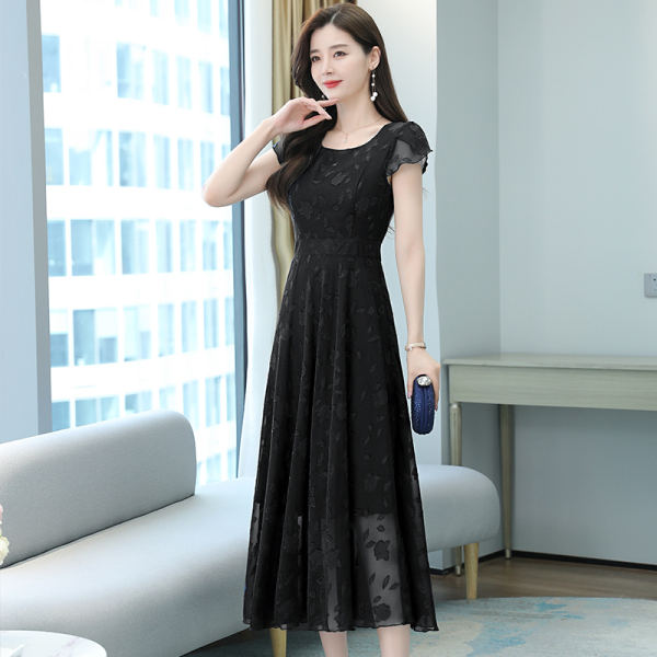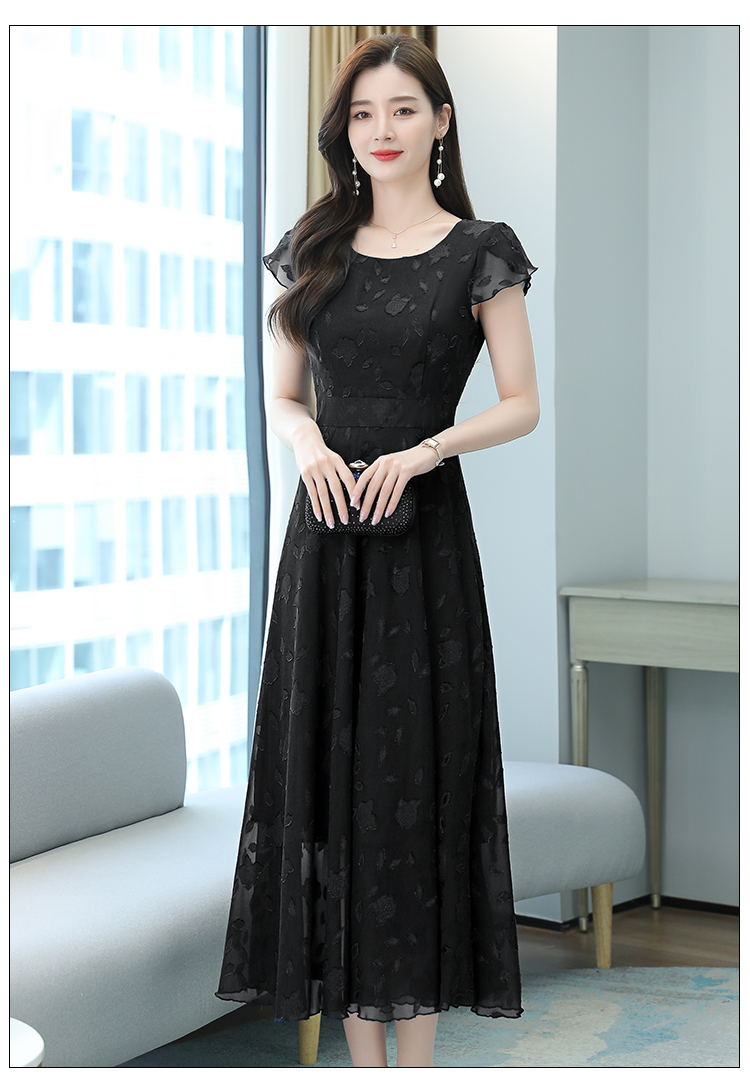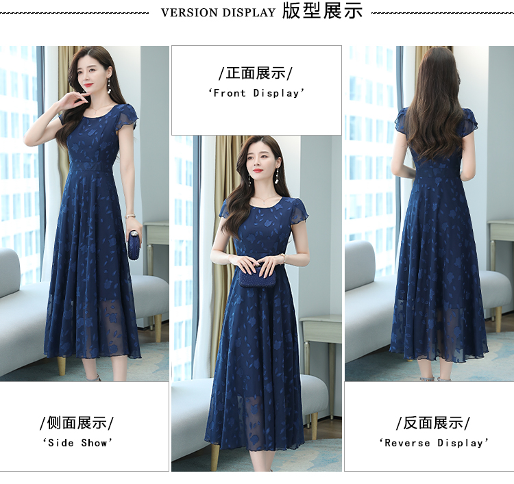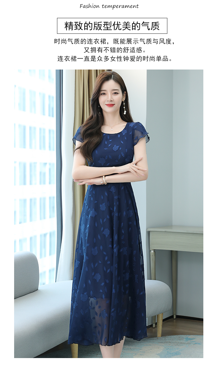 RM19371#夏季新款短袖圆领连衣裙提花收腰显瘦飘逸大摆裙女