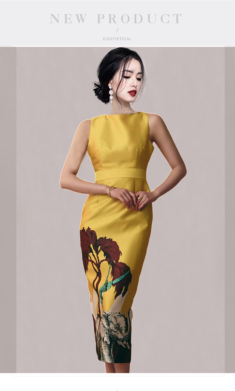 RM19835#夏季新款韩版圆领气质优雅修身中长款法式印花背心包臀连衣裙