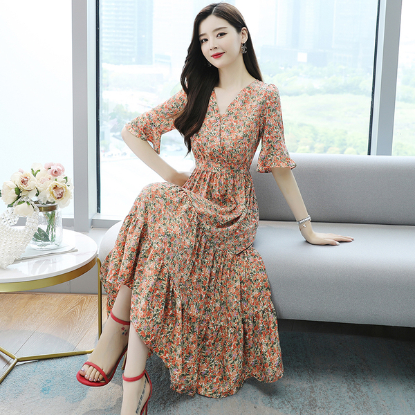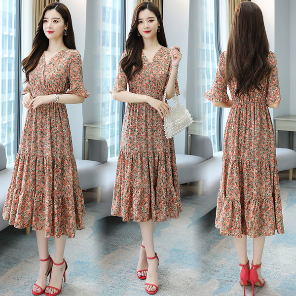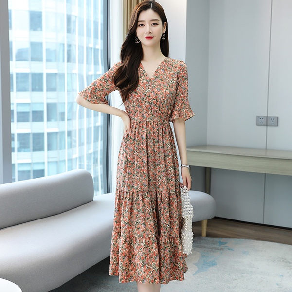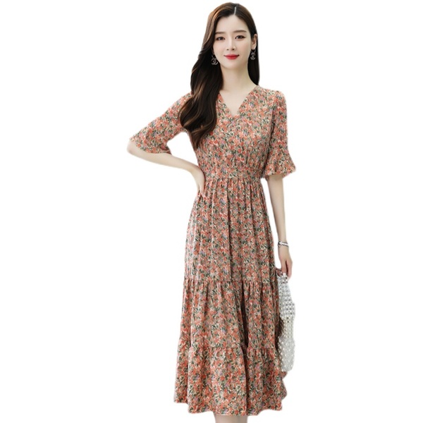 RM19815#夏季新款韩版气质ins风褶皱蛋糕裙桔梗v领碎花雪纺连衣裙女