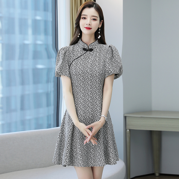 RM19816#新款旗袍改良版碎花裙女装夏季名媛复古泡泡袖收腰时尚连衣裙