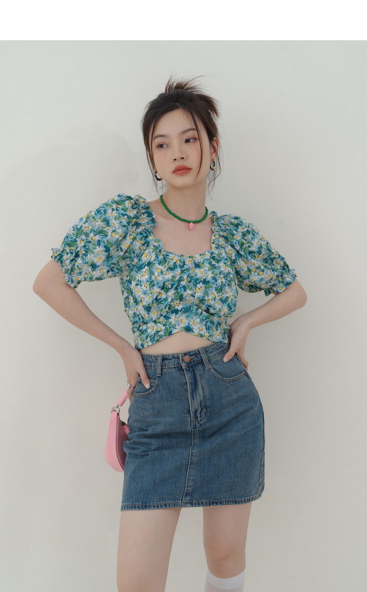 RM19673#方领碎花衬衫女夏季2023新款后背绑带性感小清新泡泡袖衬衣