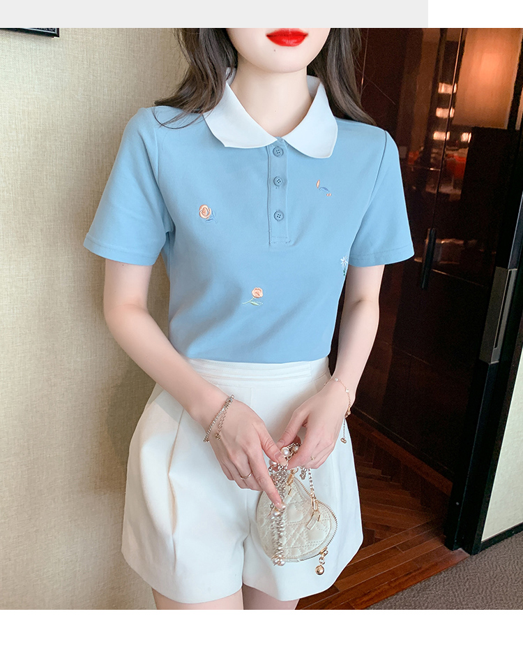 RM20148#夏季小清新气质T恤刺绣polo领减龄甜美小衫上衣
