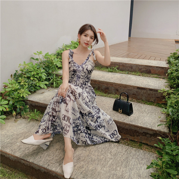 RM20185#轻奢V领雪纺超仙海边度假长裙气质显瘦印花系带吊带长裙