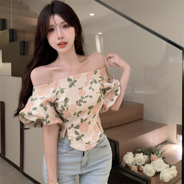 RM20211#高级感复古碎花一字肩泡泡袖开叉衬衫提花别致上衣