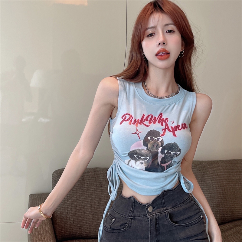 RM20212#可爱狗狗印花抽绳无袖T恤背心蓝色修身百搭辣妹上衣