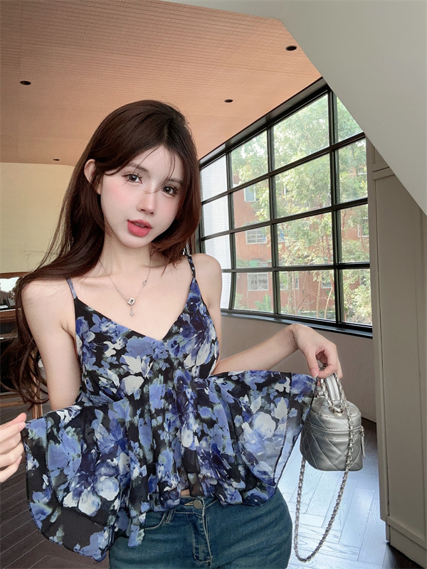 RM20215#韩版夏季新款气质不规则V领碎花无袖修身显瘦吊带背心