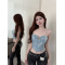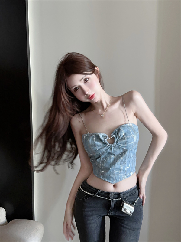 RM20217#辣妹梦幻蓝高级感亮片吊带背心爱心金属扣镂空露背上衣