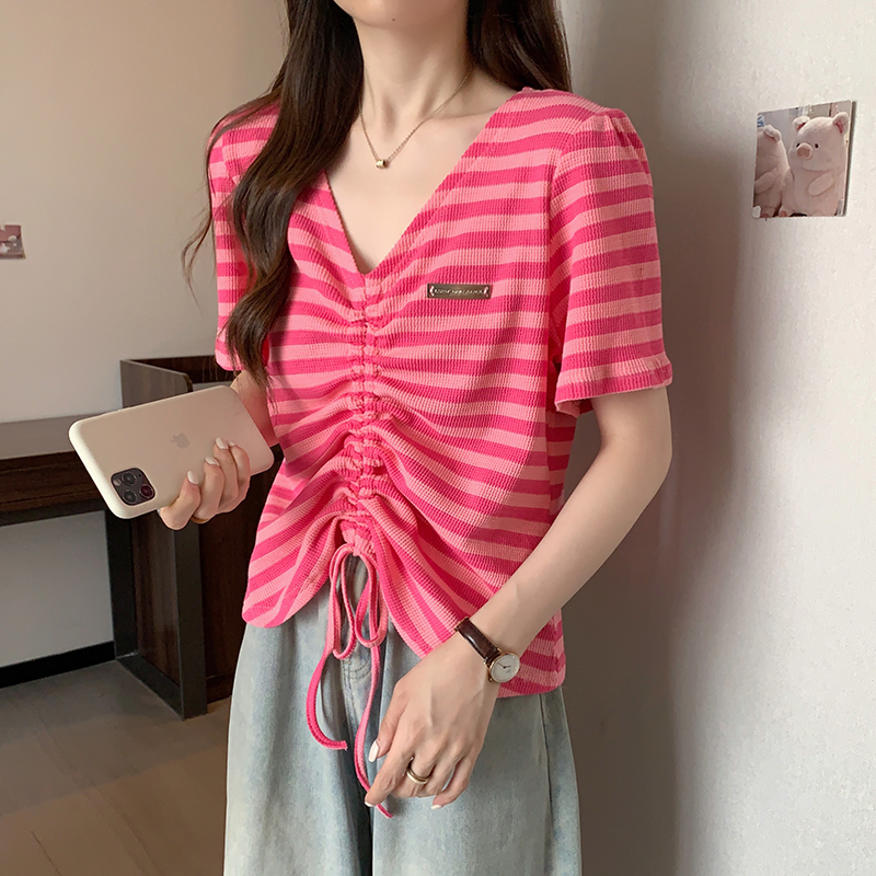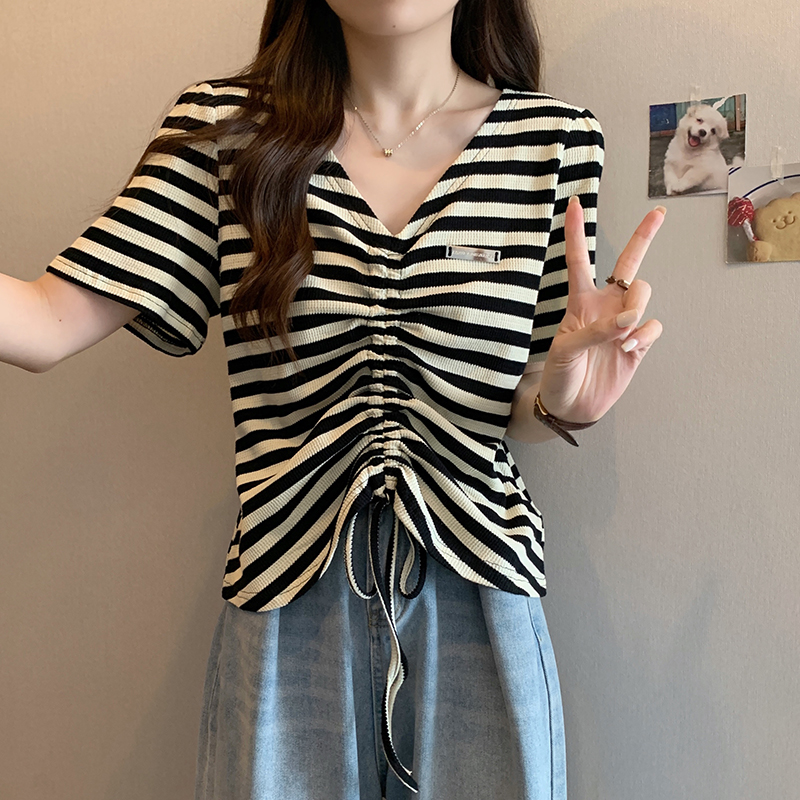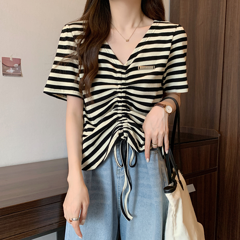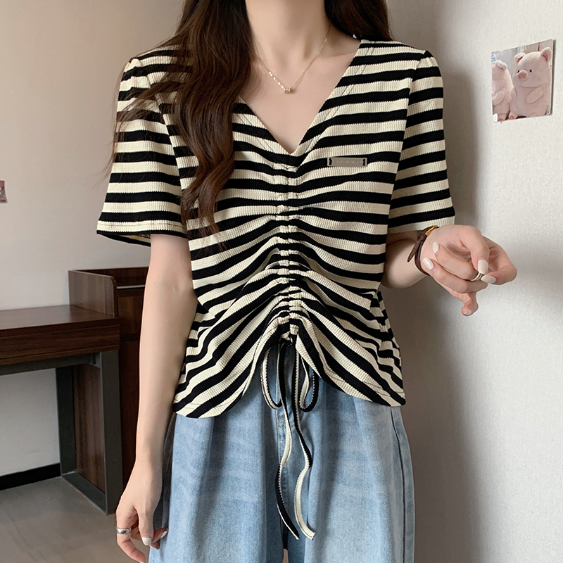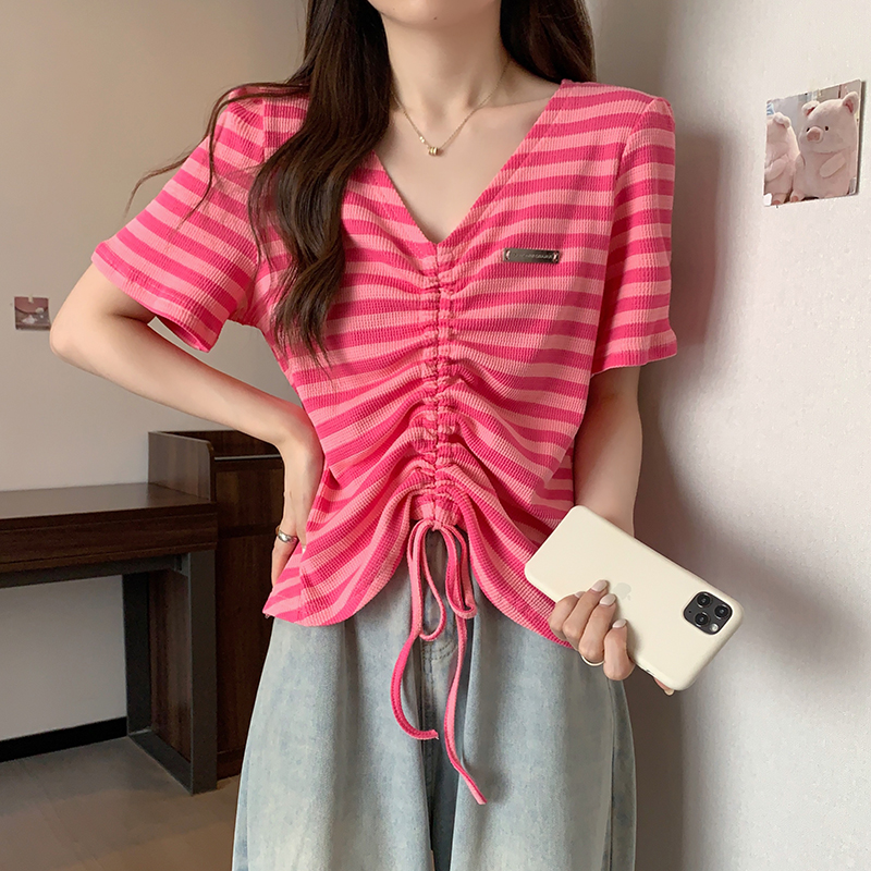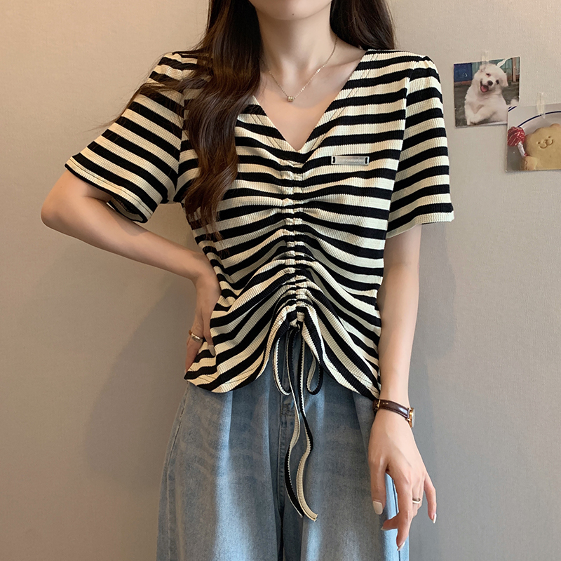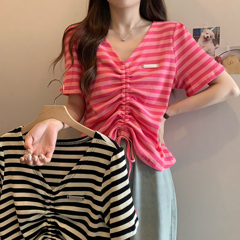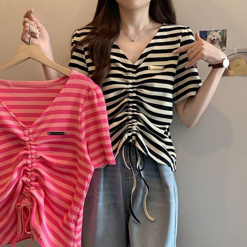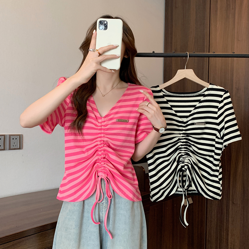 RM20222#夏装新款胖mm百搭多巴胺穿搭抽绳遮肚腩条纹短袖上衣T恤