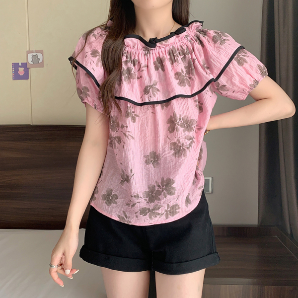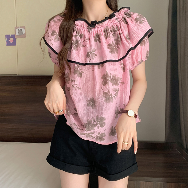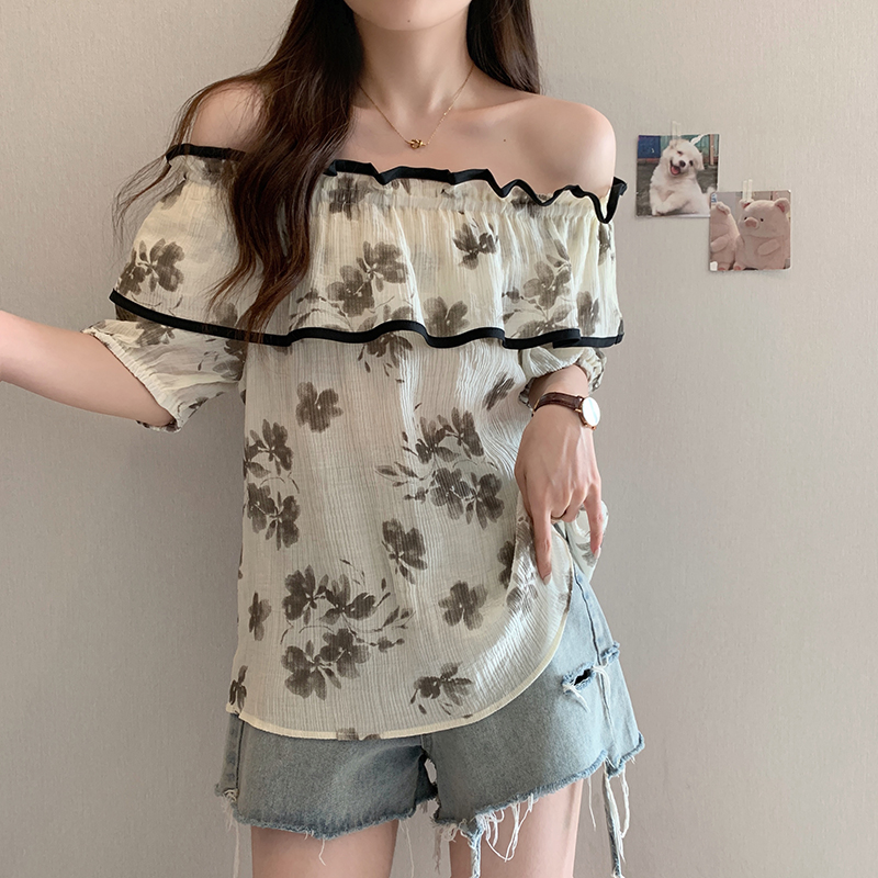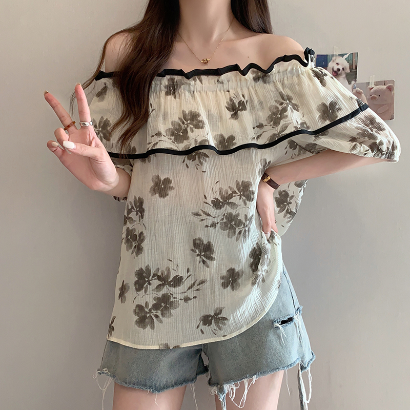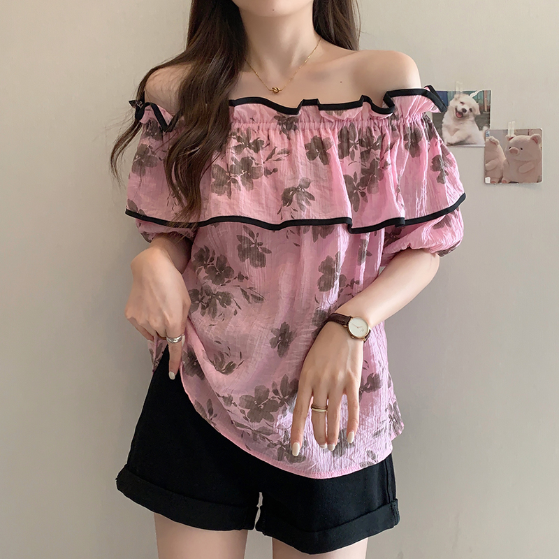 RM20227#夏装新款胖mm大码多巴胺穿搭一字领露肩印花雪纺小衫衬衣