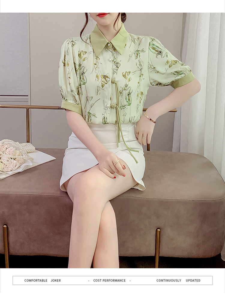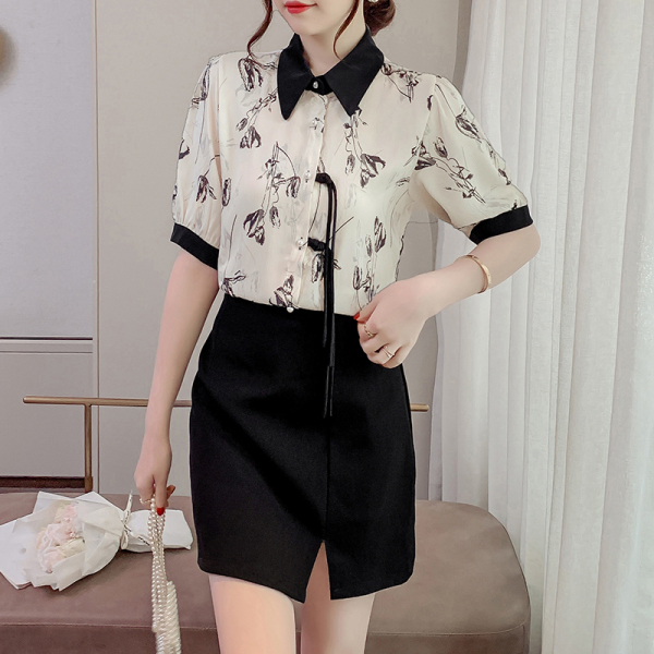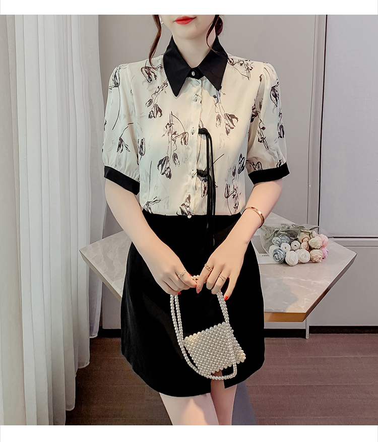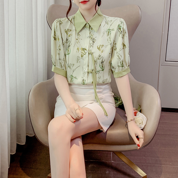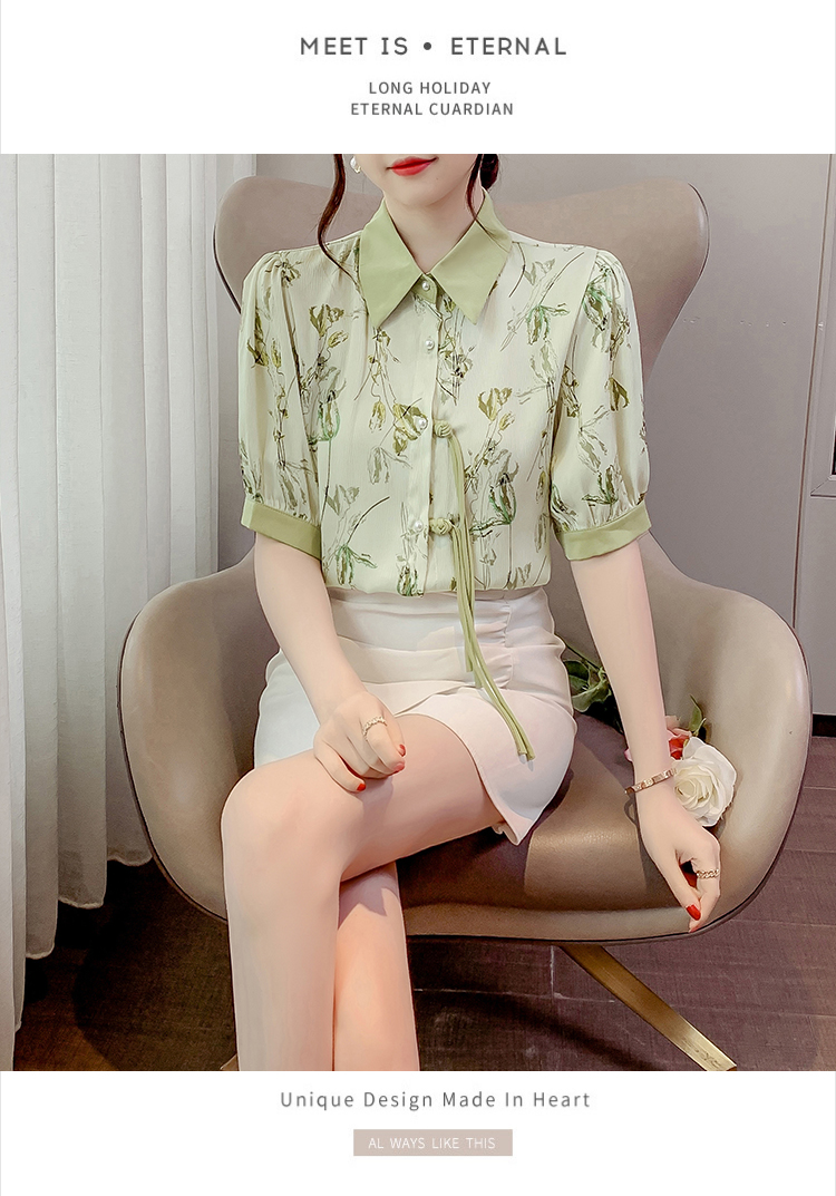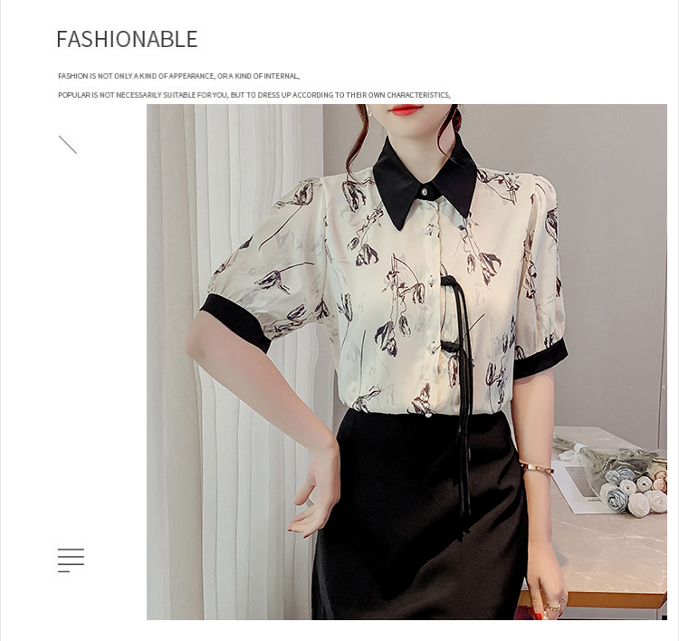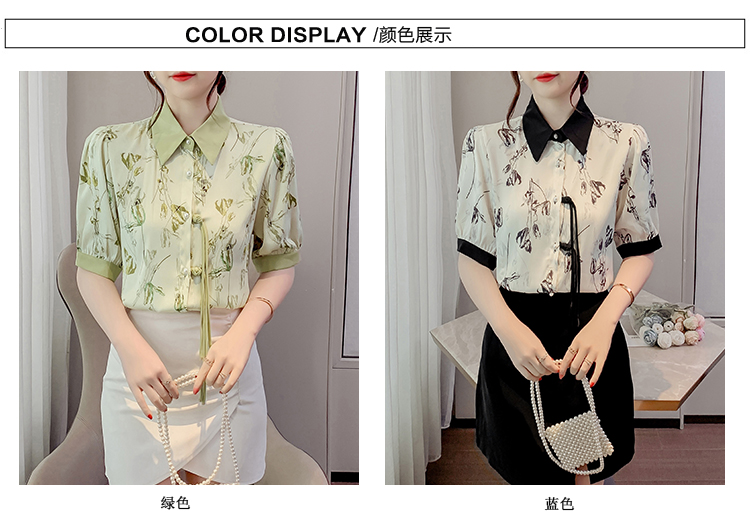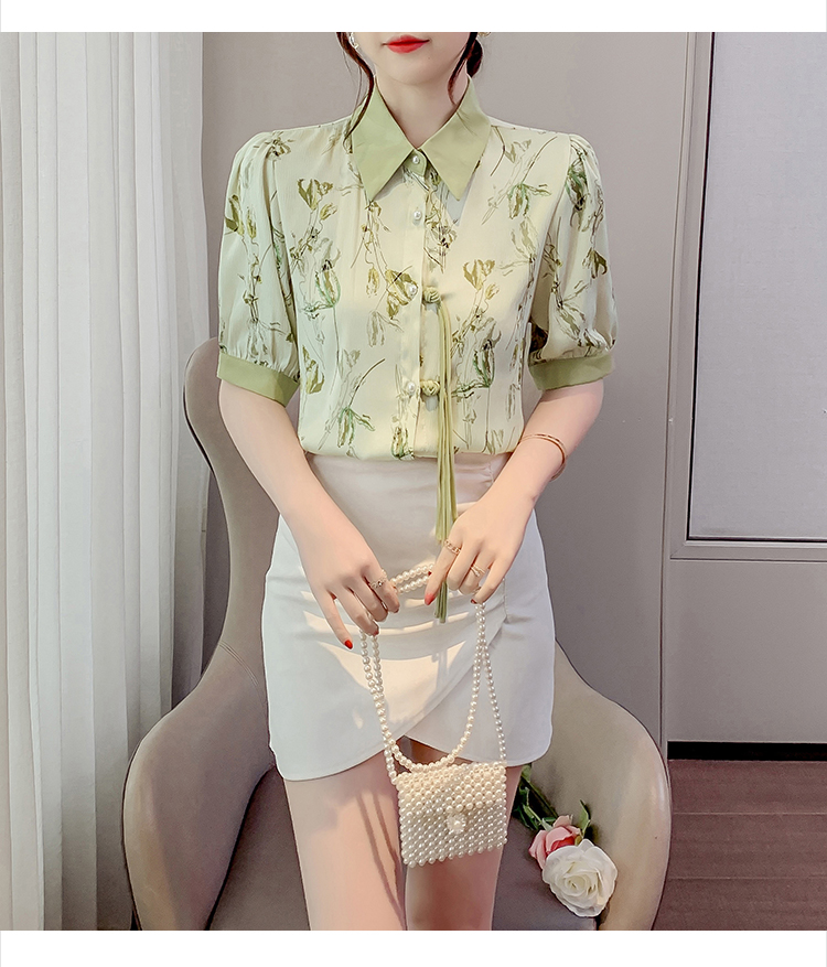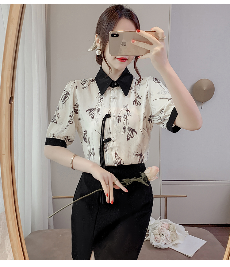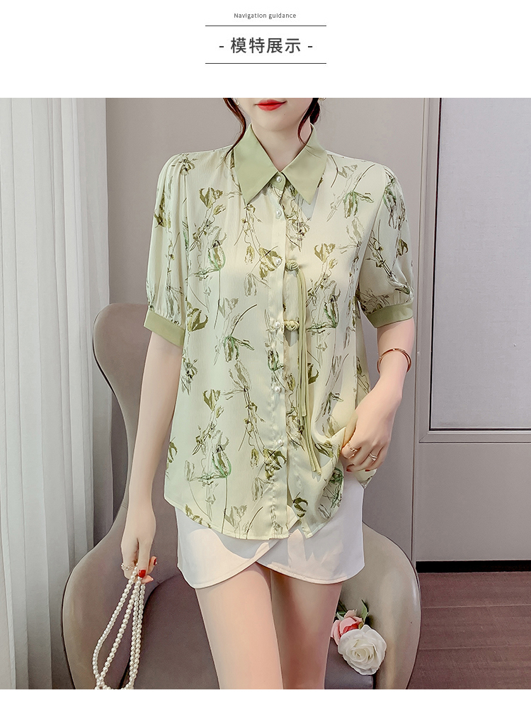 RM20246#复古写意水墨印花国风盘扣流苏POLO领短袖衬衫女2023夏季新款上衣