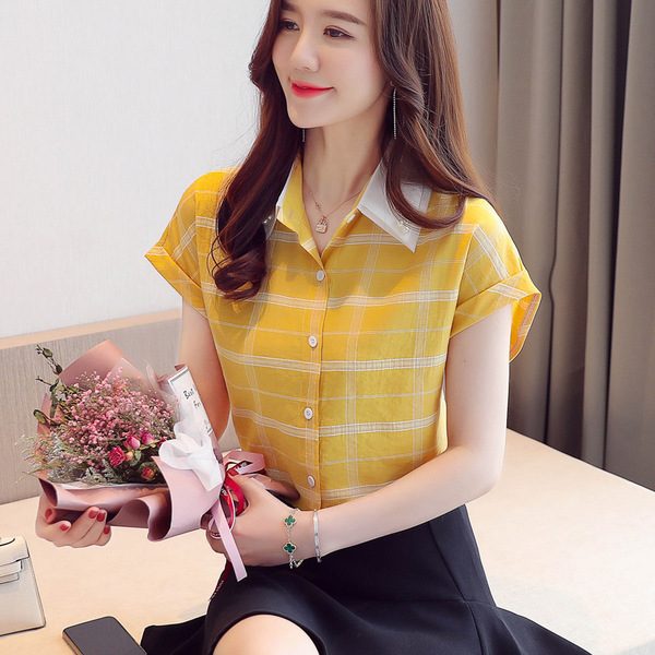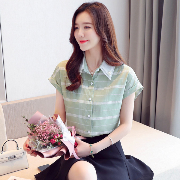 RM20271#洋气雪纺衫衬衫女夏装新款撞色领短袖打底衫小衫大格上衣