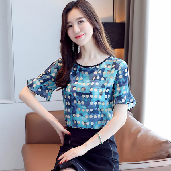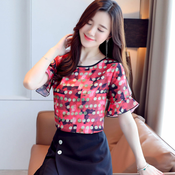 RM20273#洋气花色雪纺衫衬衫女夏装新款短袖打底衫小衫露肩圆领上衣