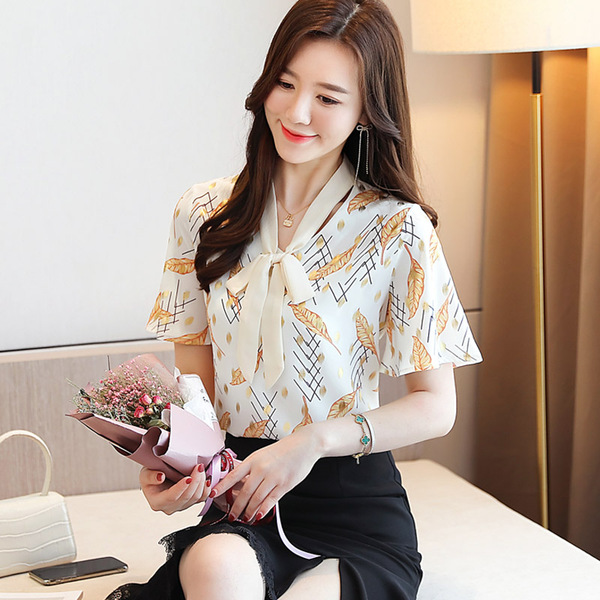 RM20275#花色雪纺衫衬衫女夏装新款短袖打底衫小衫韩版喇叭袖上衣服潮