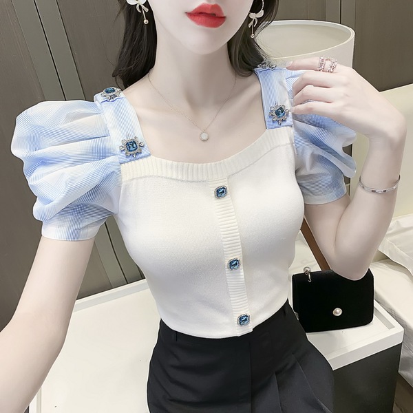 RM20544#夏季短袖方领针织修身拼接纯棉夏装t恤洋气ins小众上衣