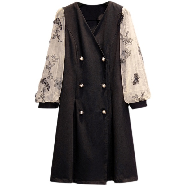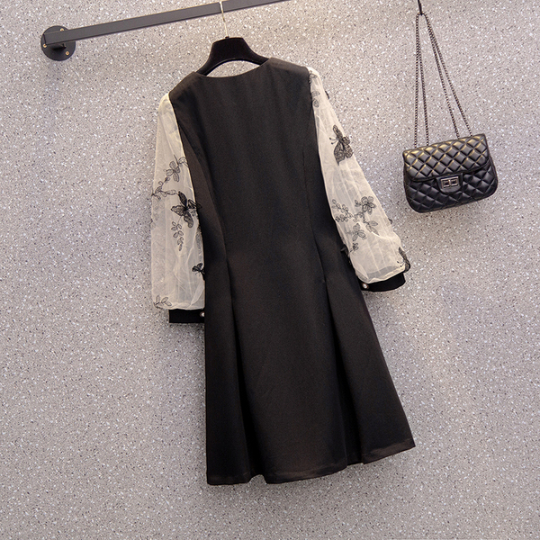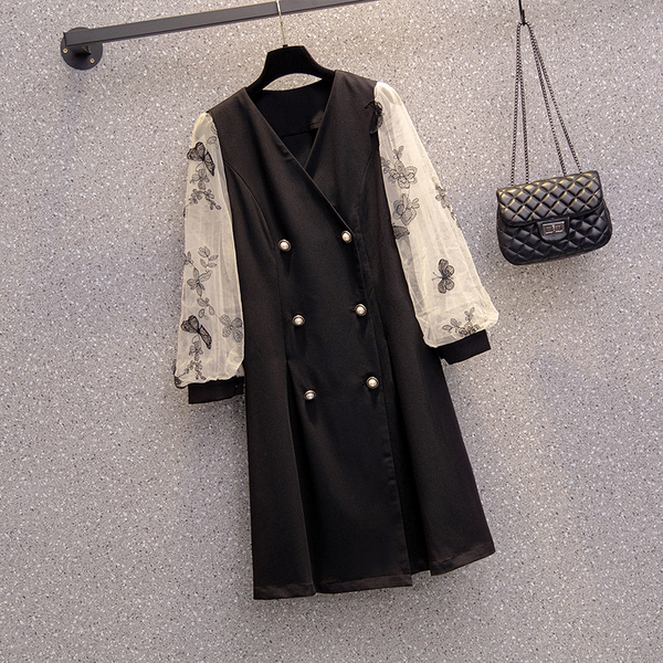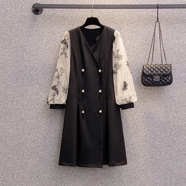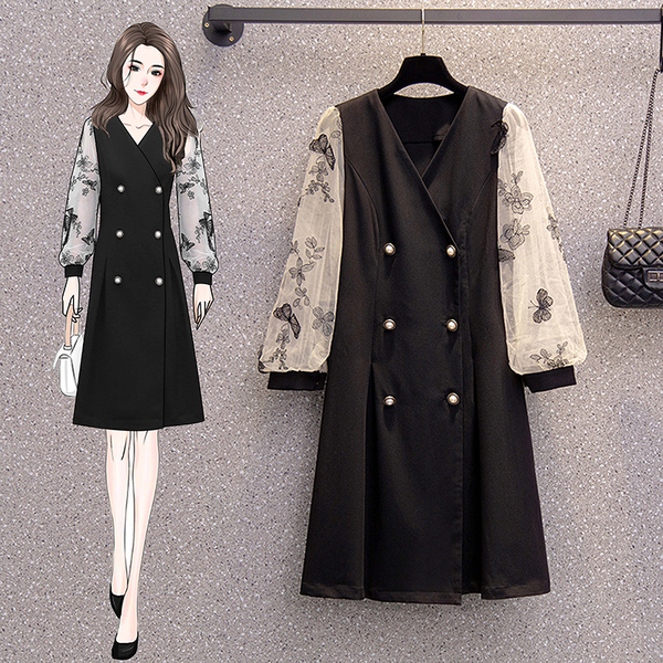 RM20602#早秋大码女装时尚修身纽扣修身套头蝴蝶网纱拼接连衣裙