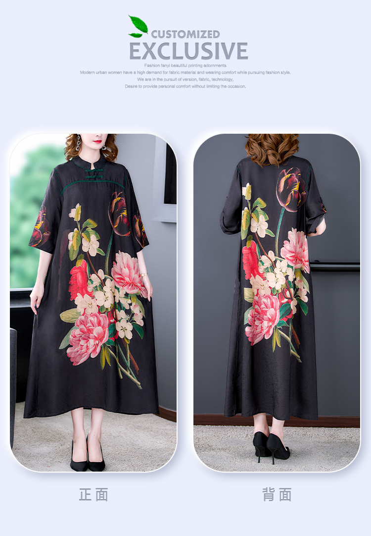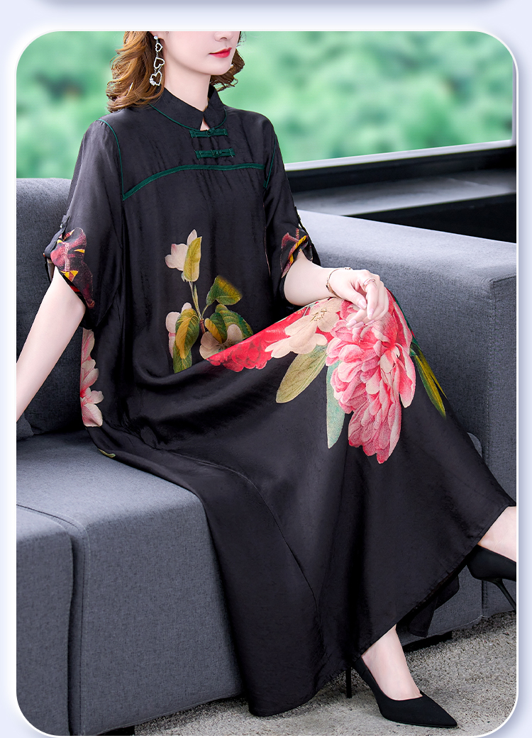 RM20822#复古大码真丝印花连衣裙2023新款原创民族风宽松改良盘扣长裙