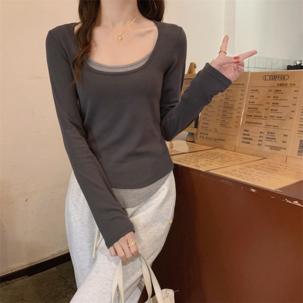 RM20965#新款u领设计感假两件拼接短款修身长袖T恤
