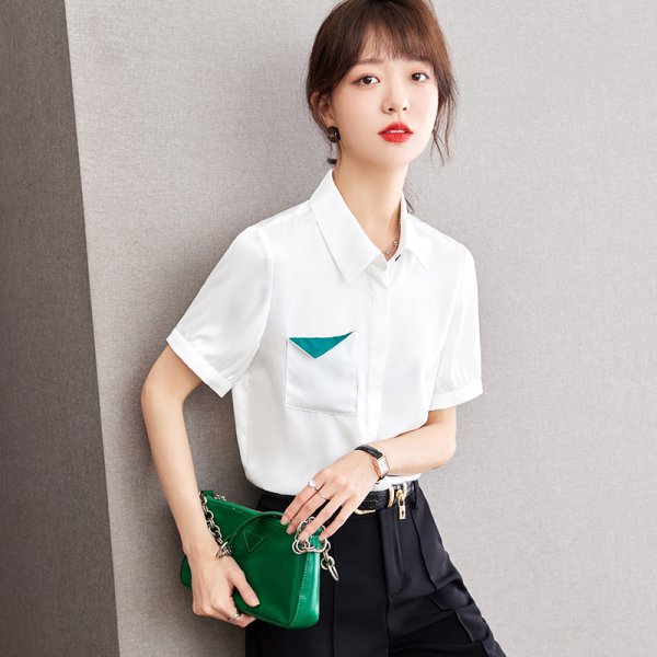 RM21017#夏季新款短袖时尚通勤撞色口袋简约衬衣女士衬衫