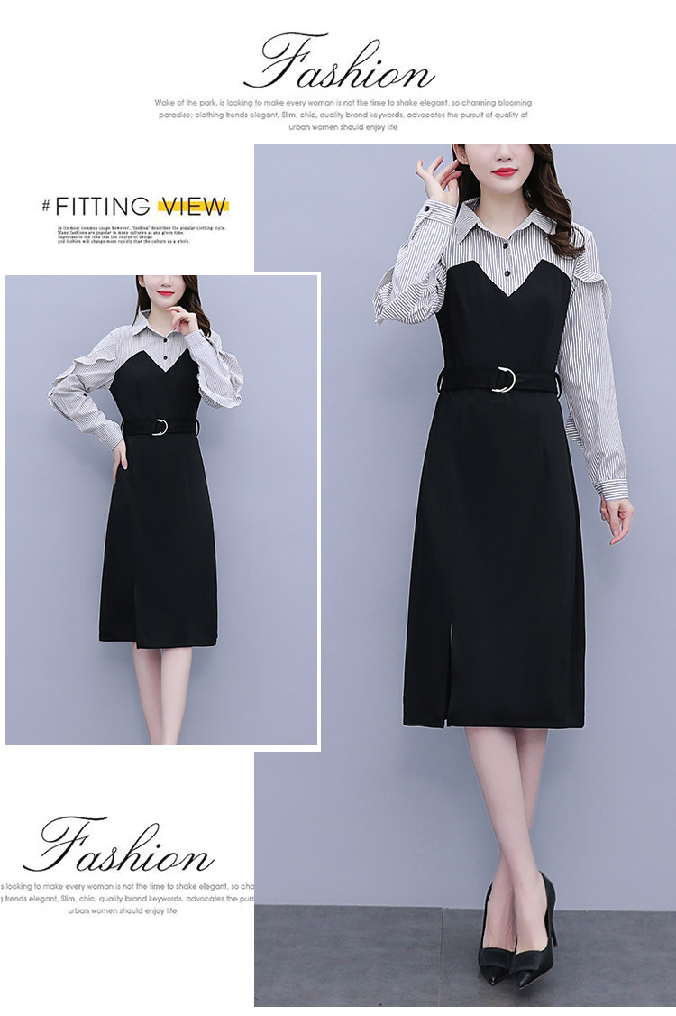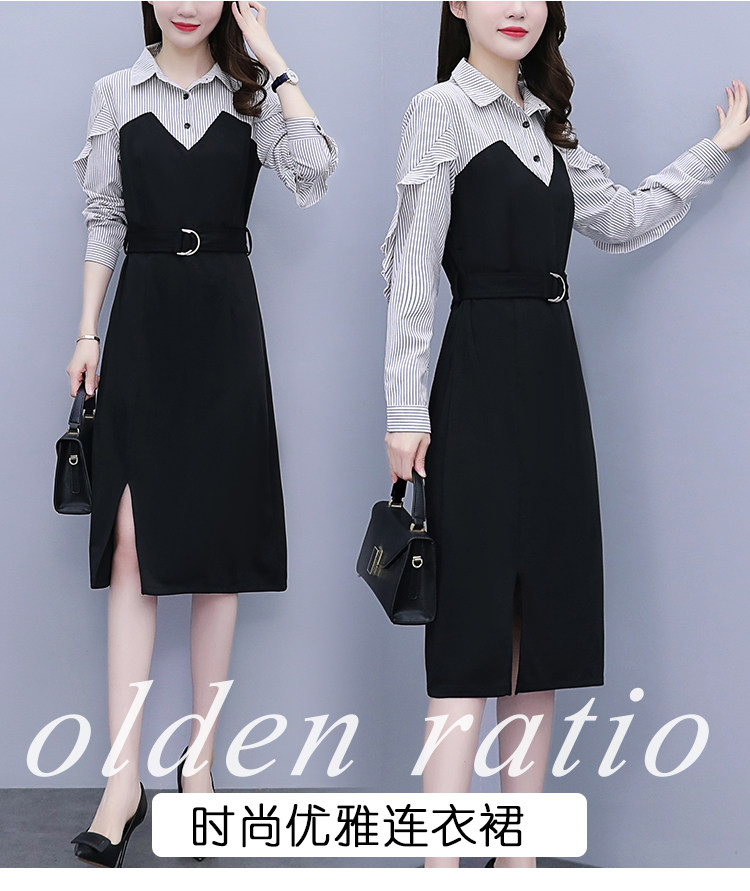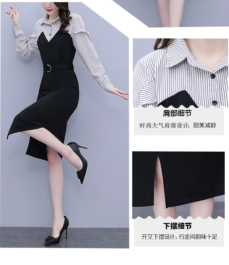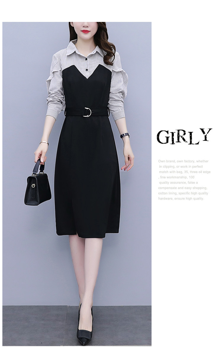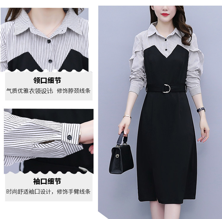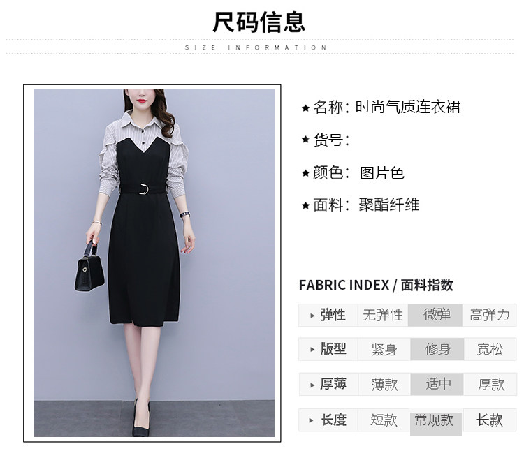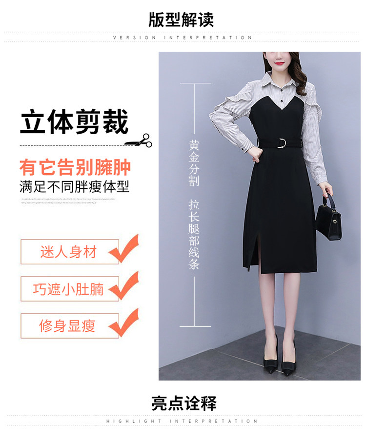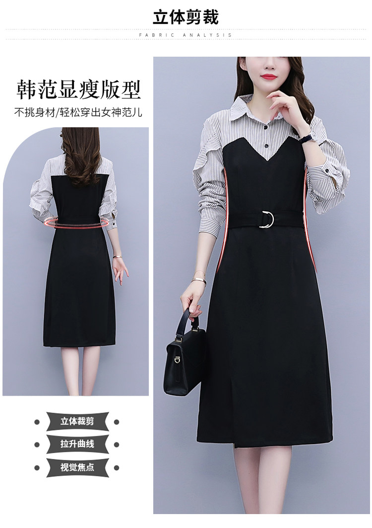 RM21050#新款韩版大码女装小香风修身条纹假两件拼接连衣裙