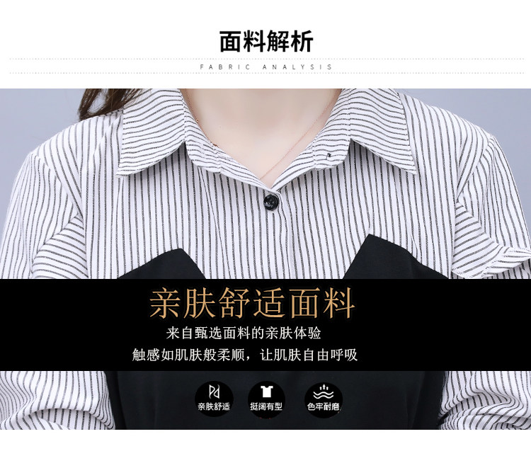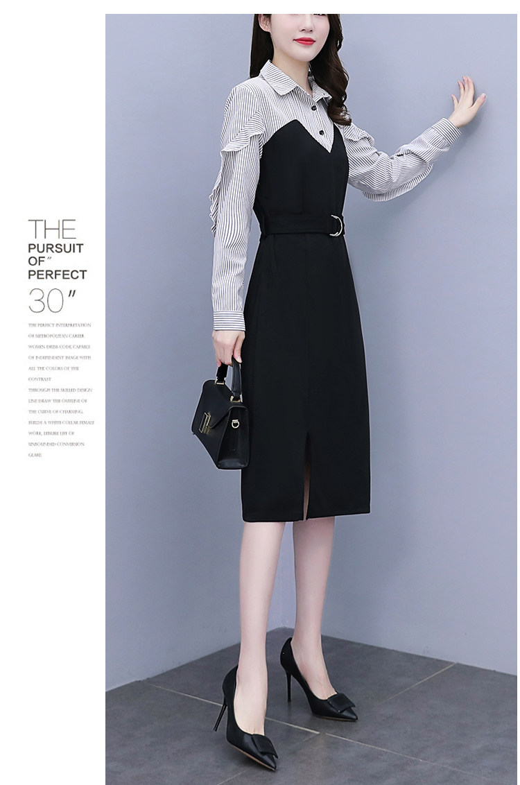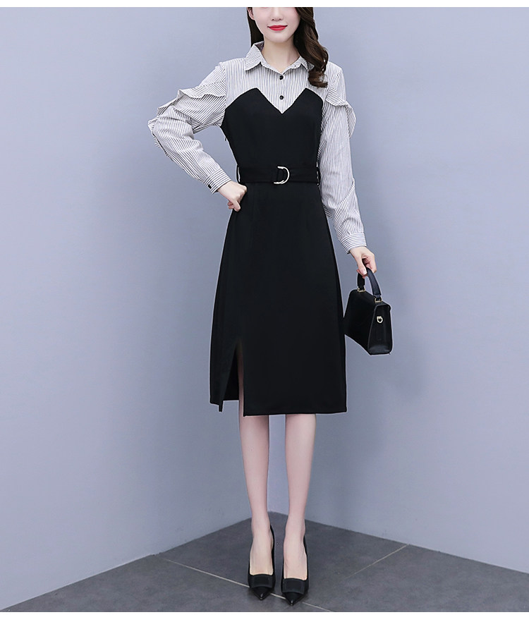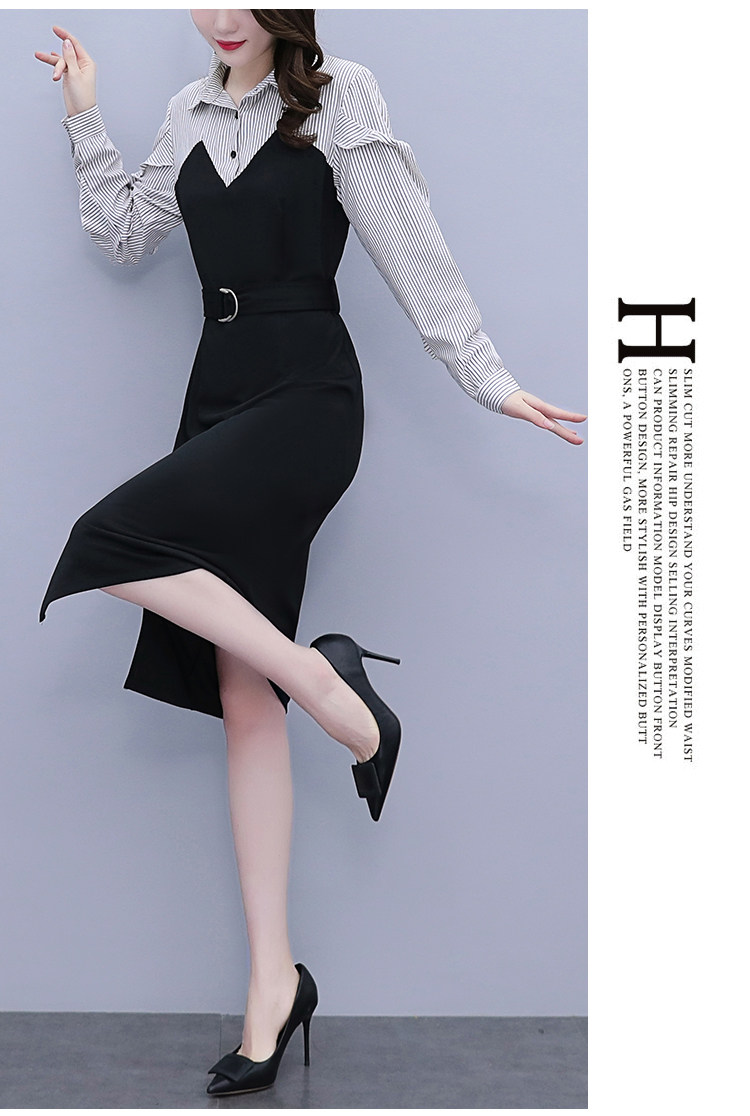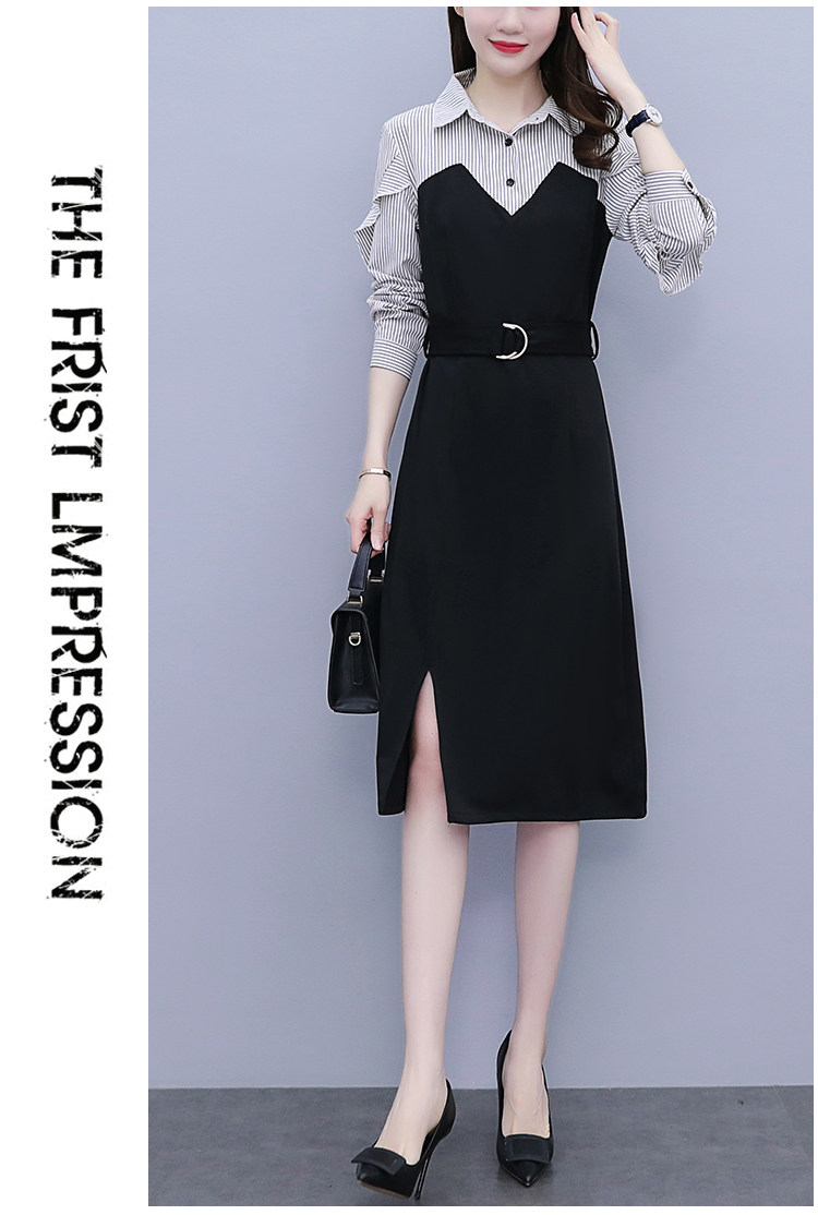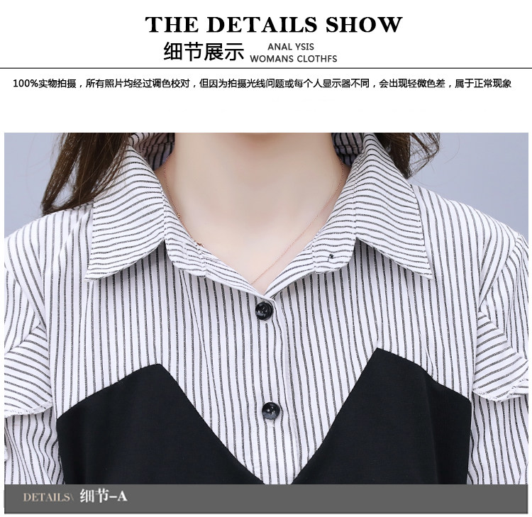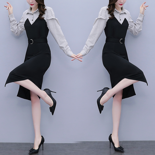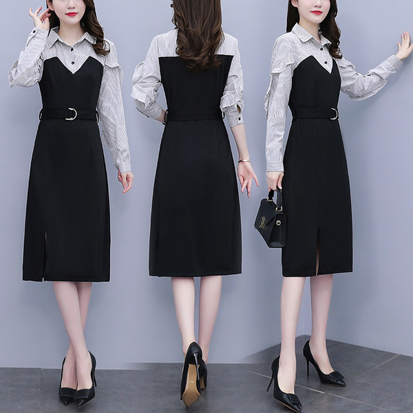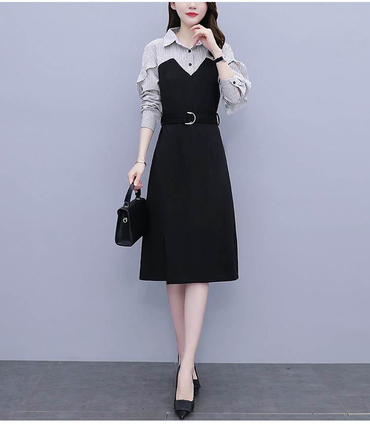 RM21050#新款韩版大码女装小香风修身条纹假两件拼接连衣裙