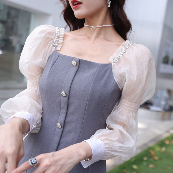 RM21288#新款收腰显瘦气质名媛小香风洋气方领法式连衣裙