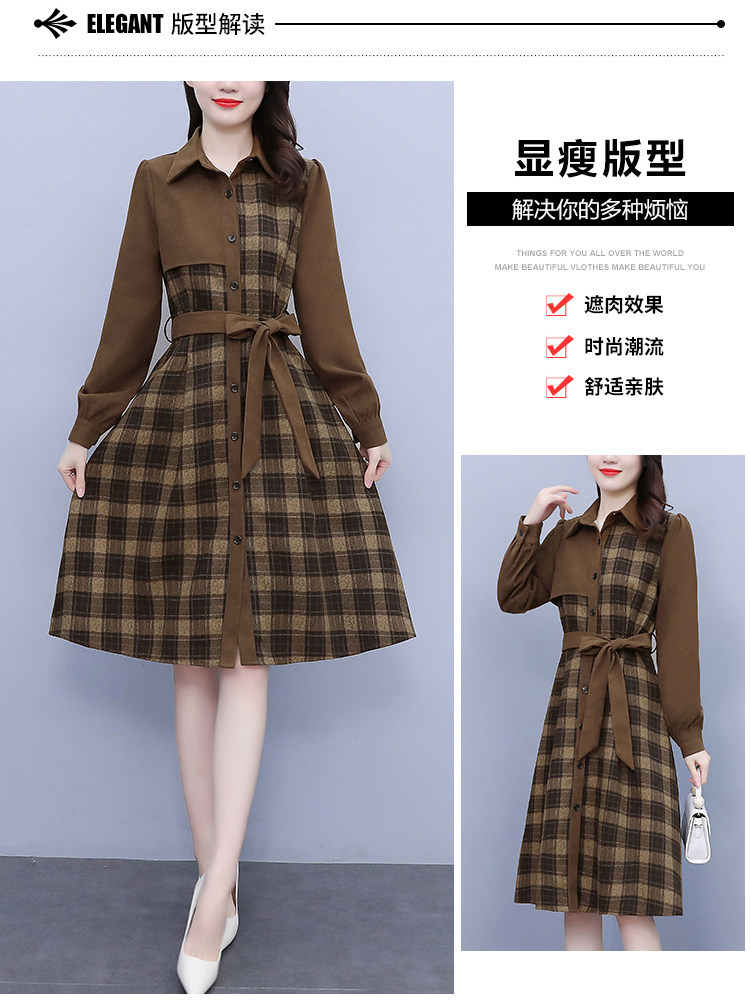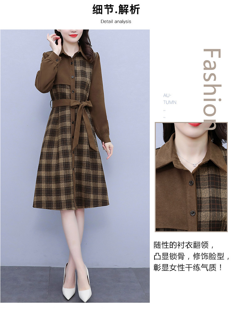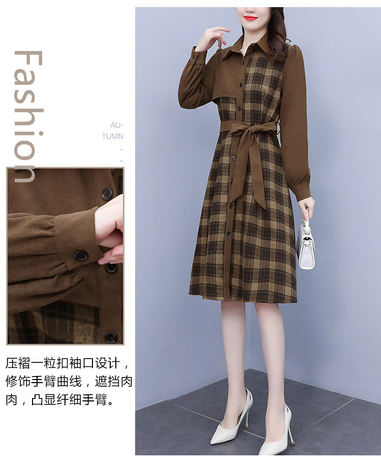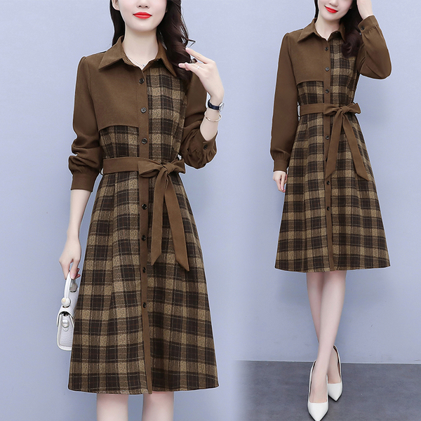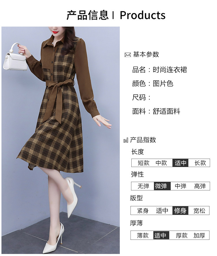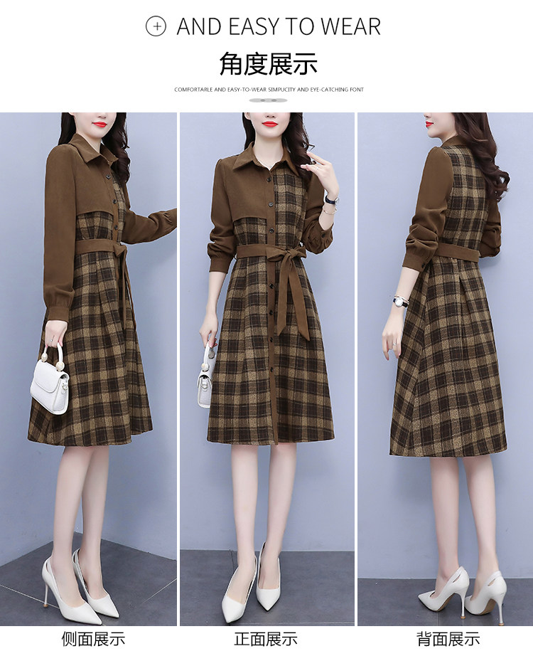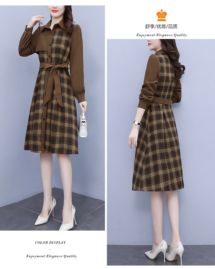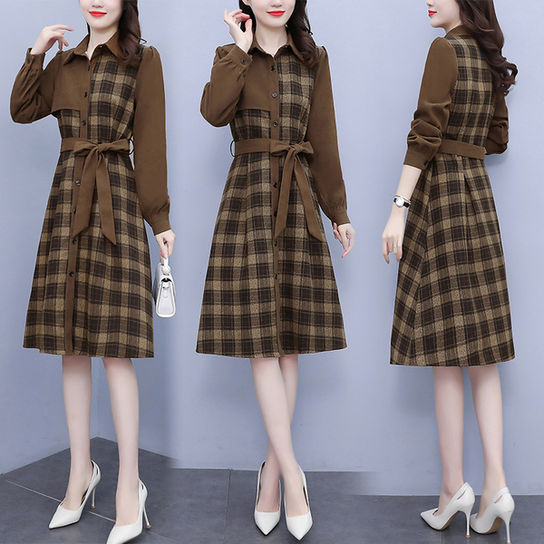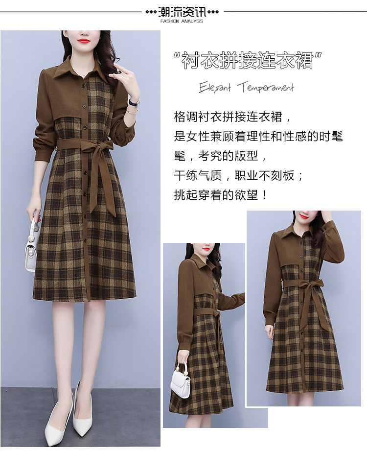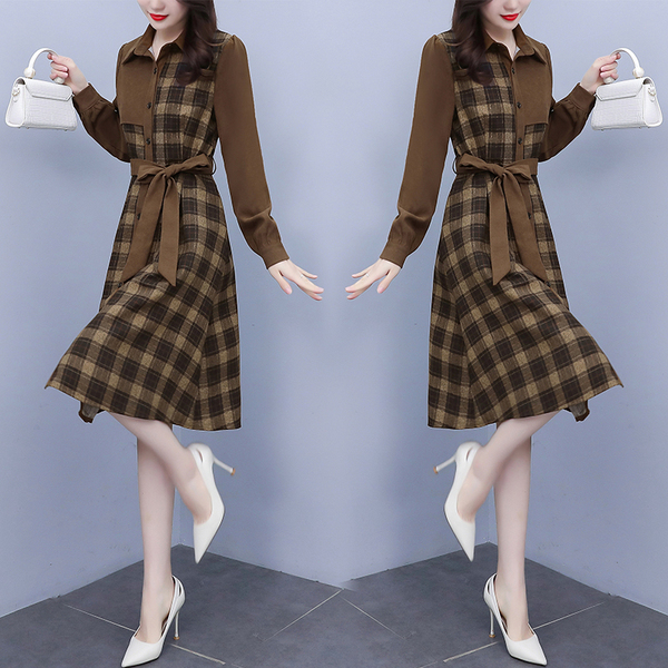 RM21299#大码女装百搭格纹撞色拼接套头衬衫领减龄显瘦连衣裙