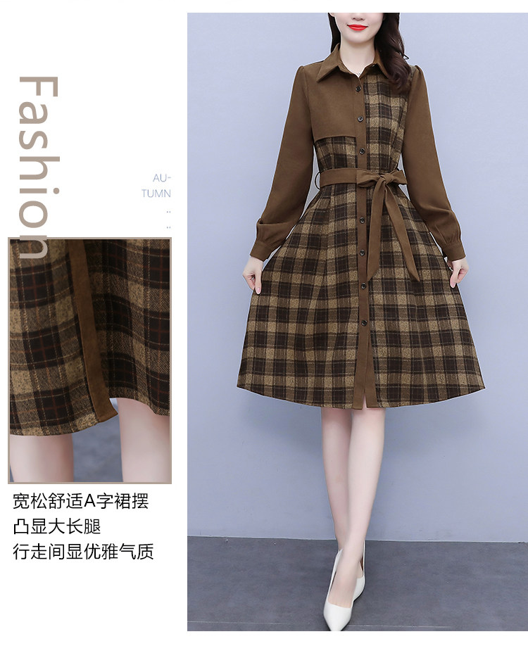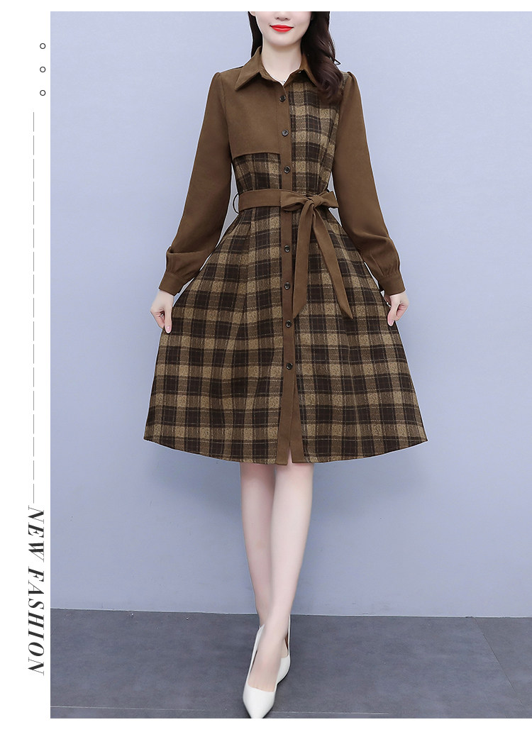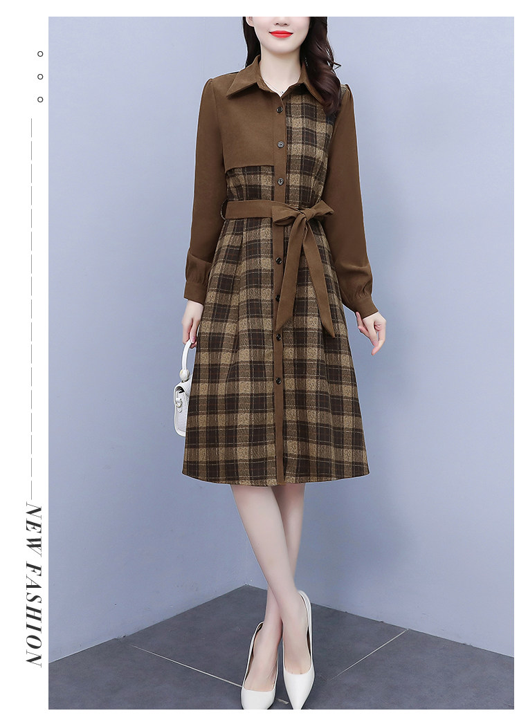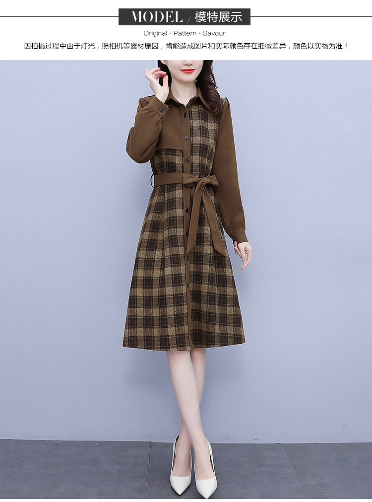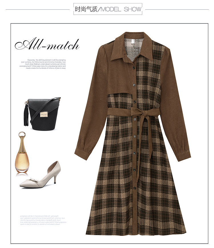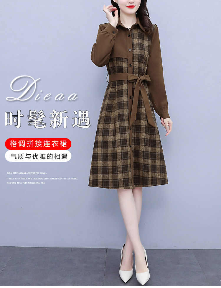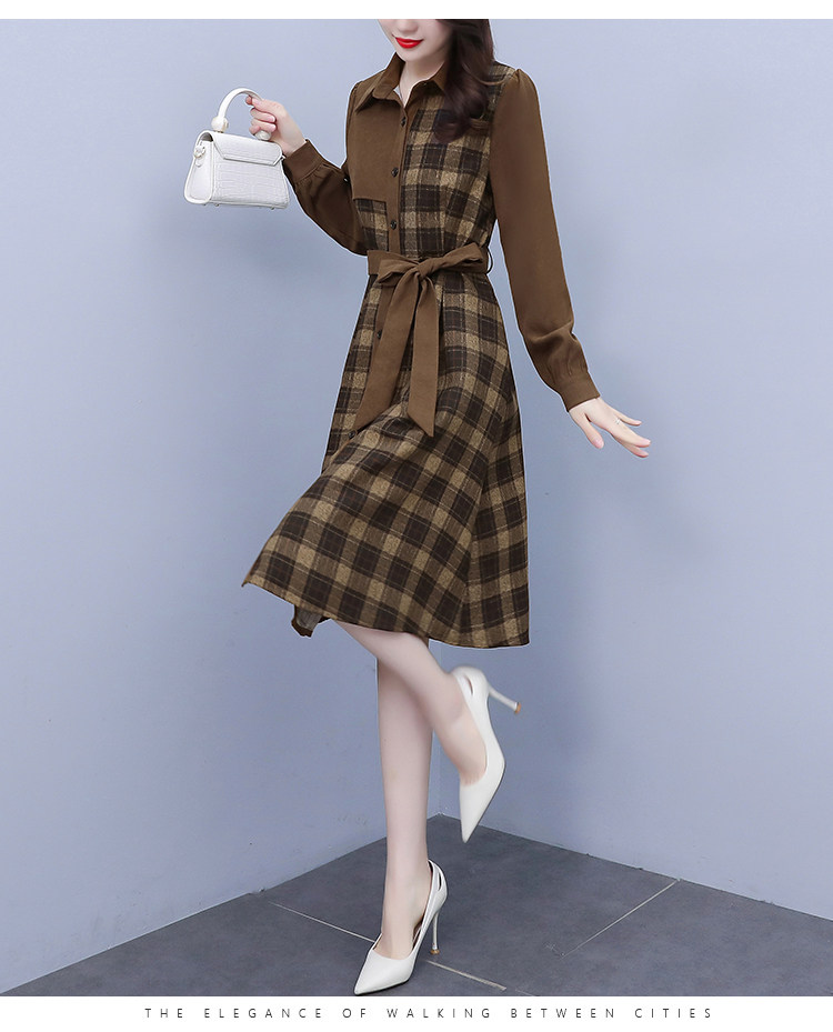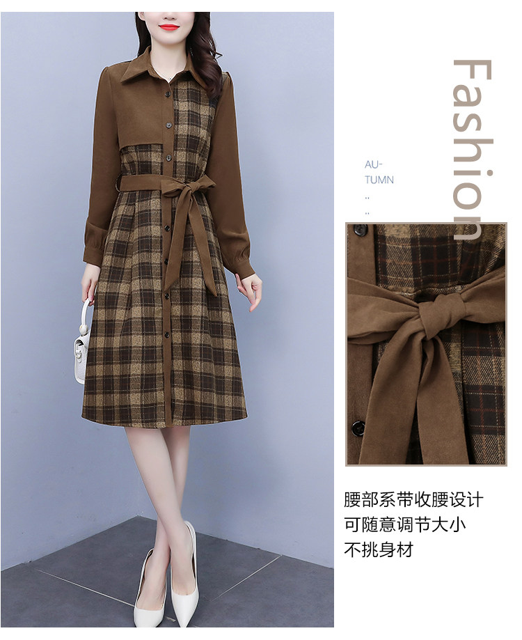 RM21299#大码女装百搭格纹撞色拼接套头衬衫领减龄显瘦连衣裙