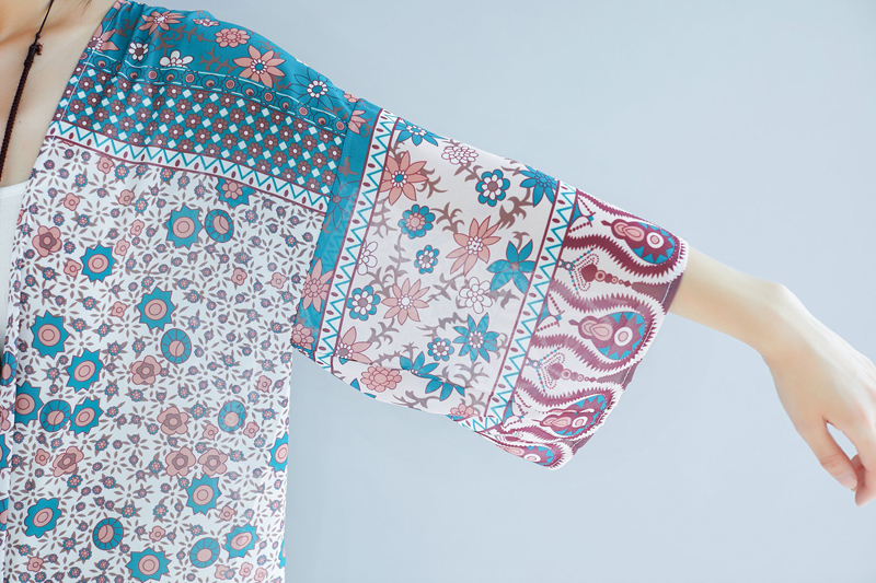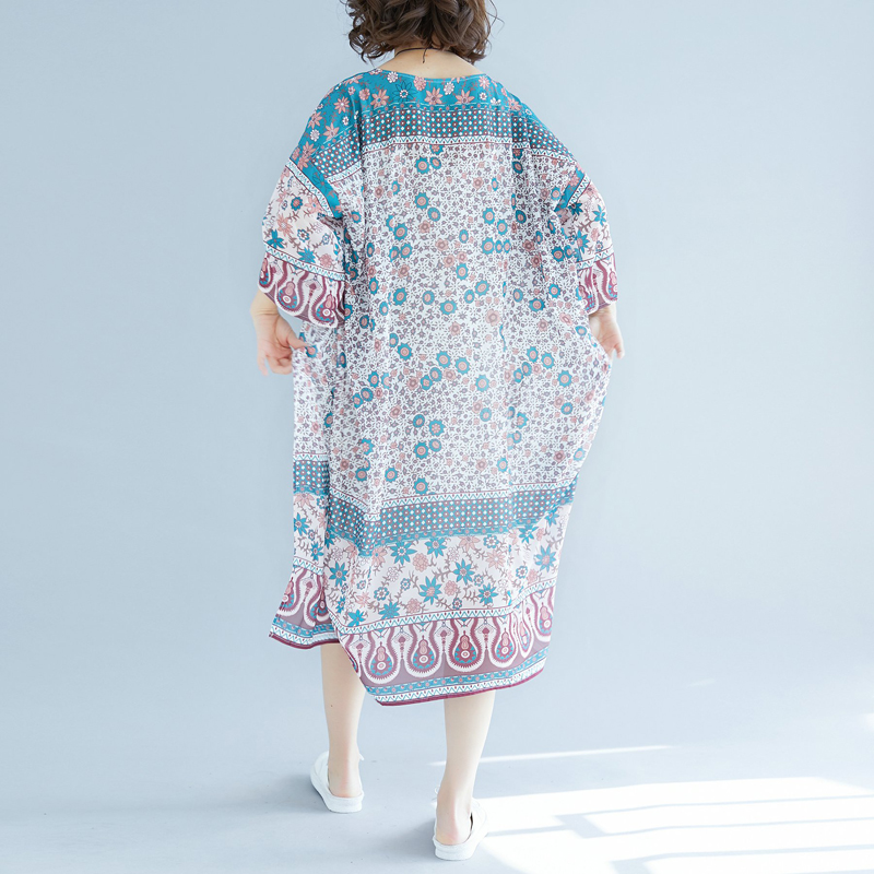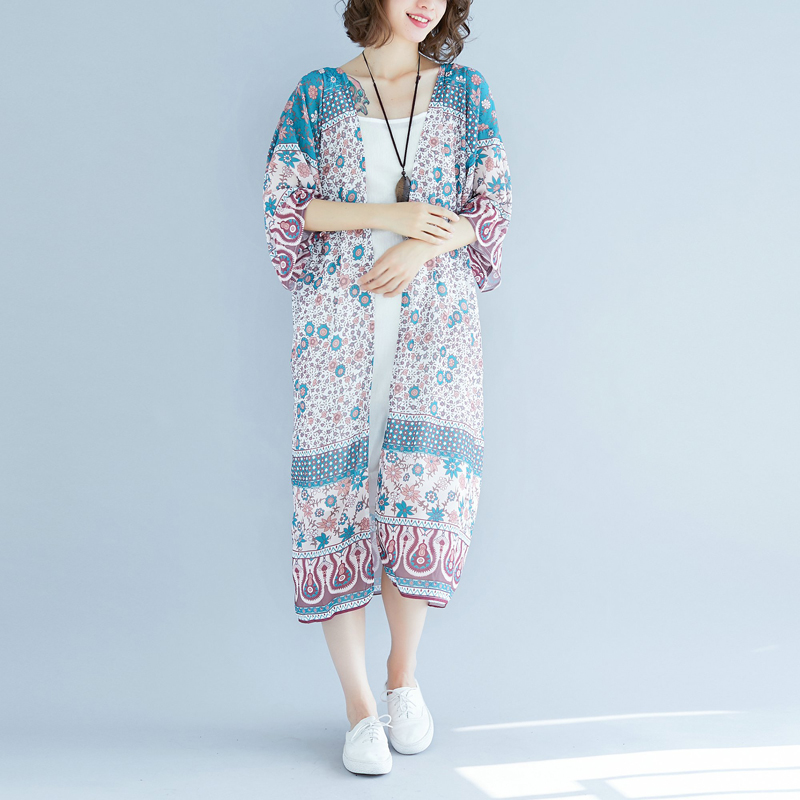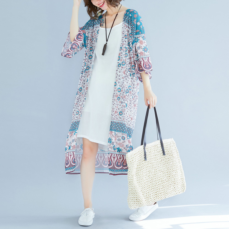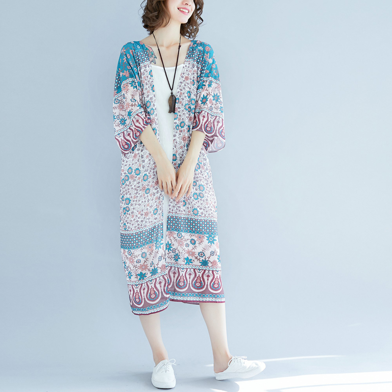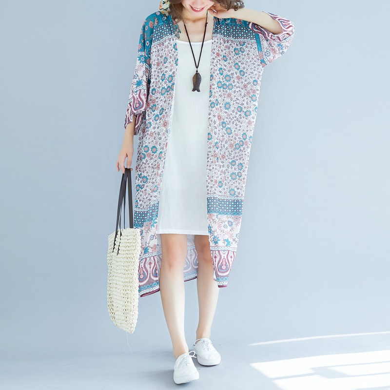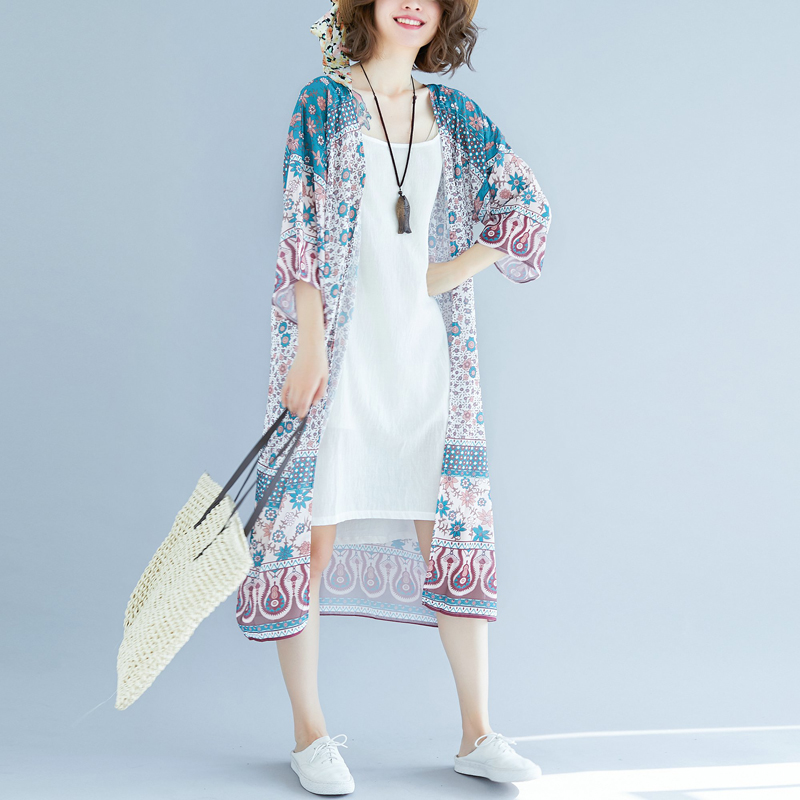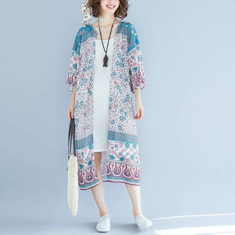 RM21597#胖MM中长款雪纺印花百搭开衫防晒衣外披空调衫女