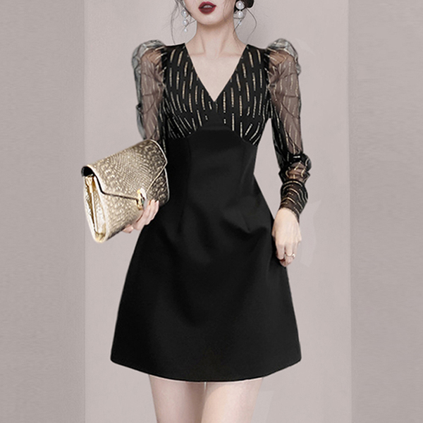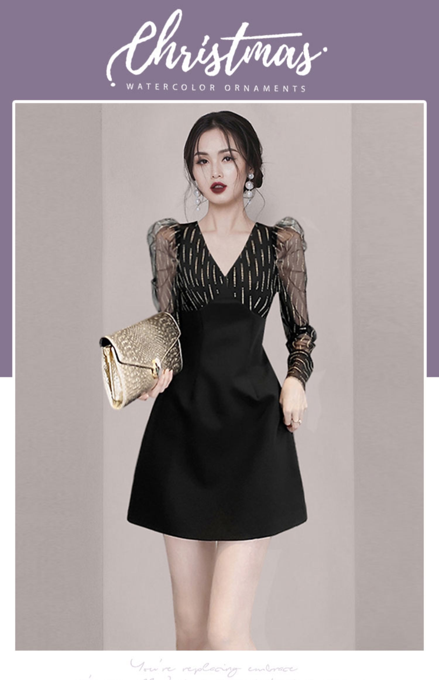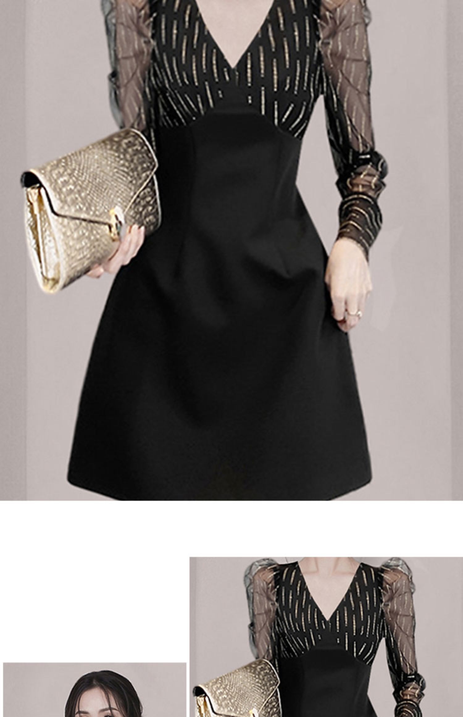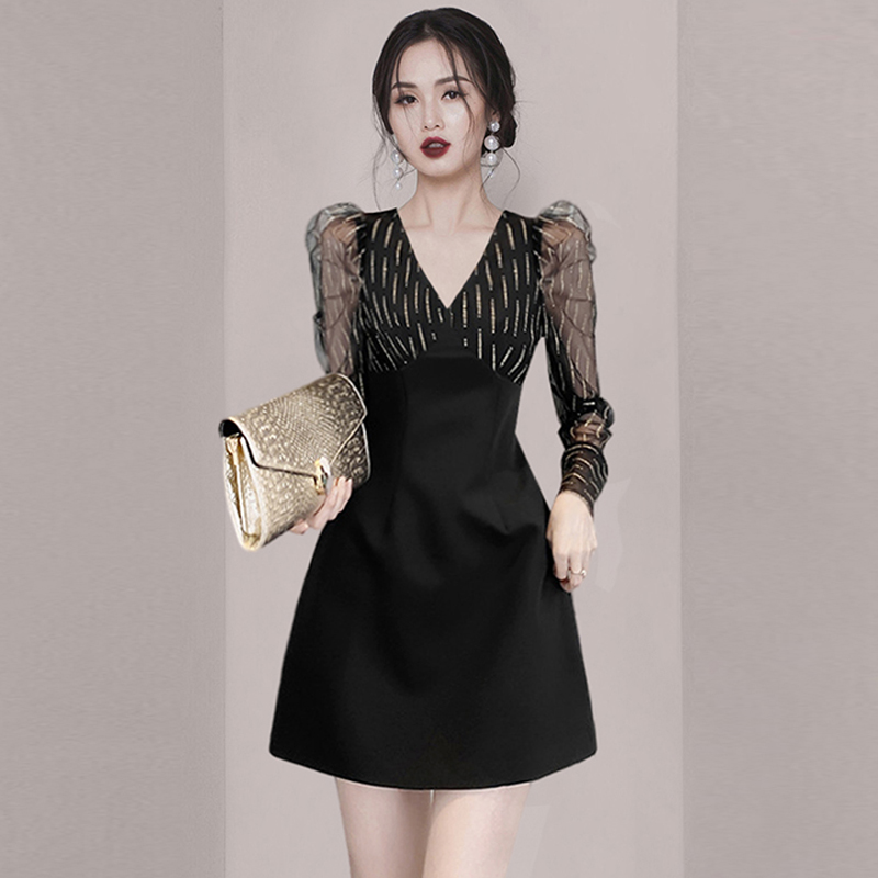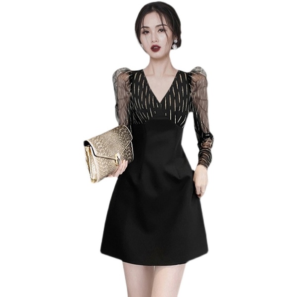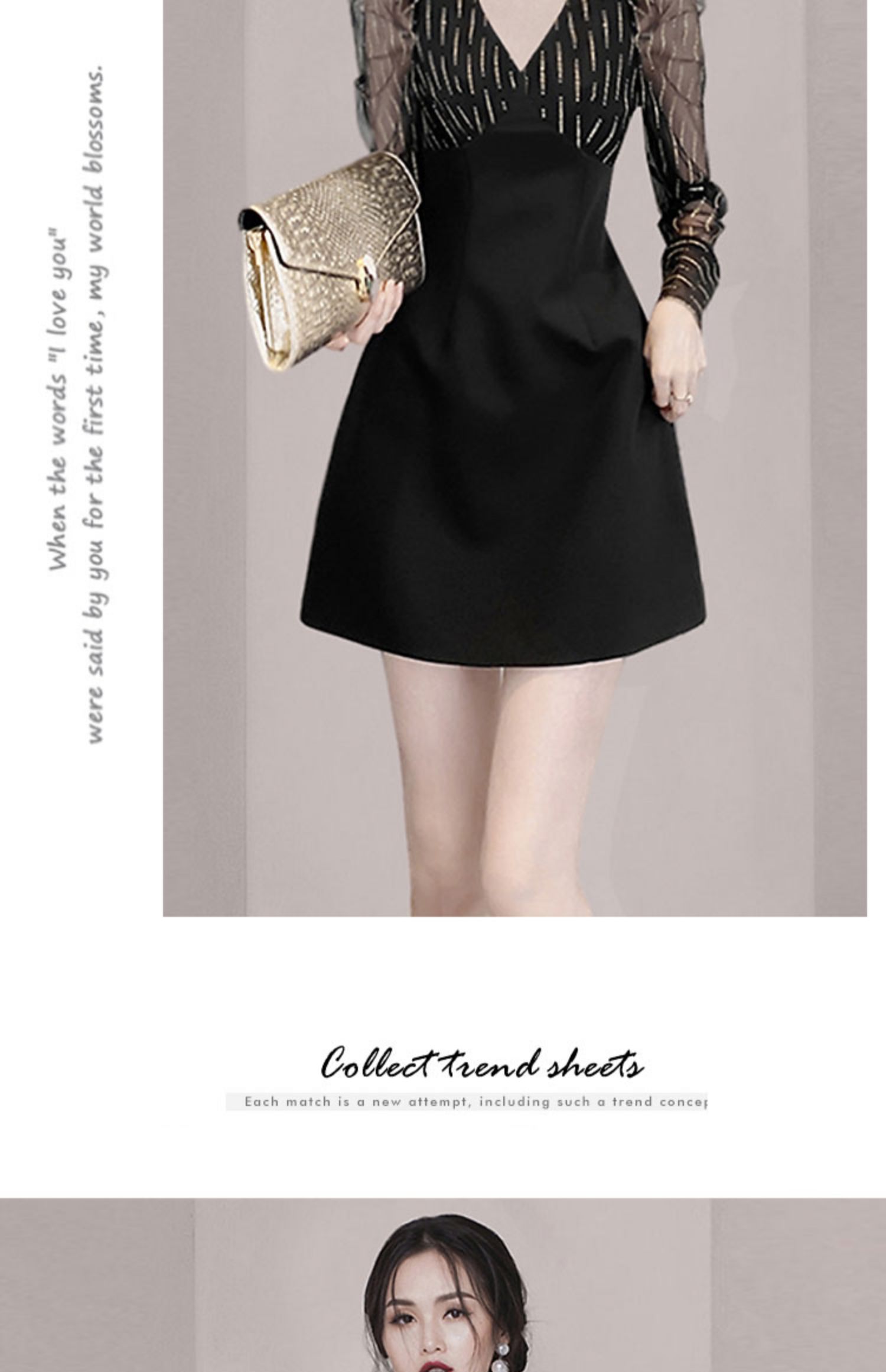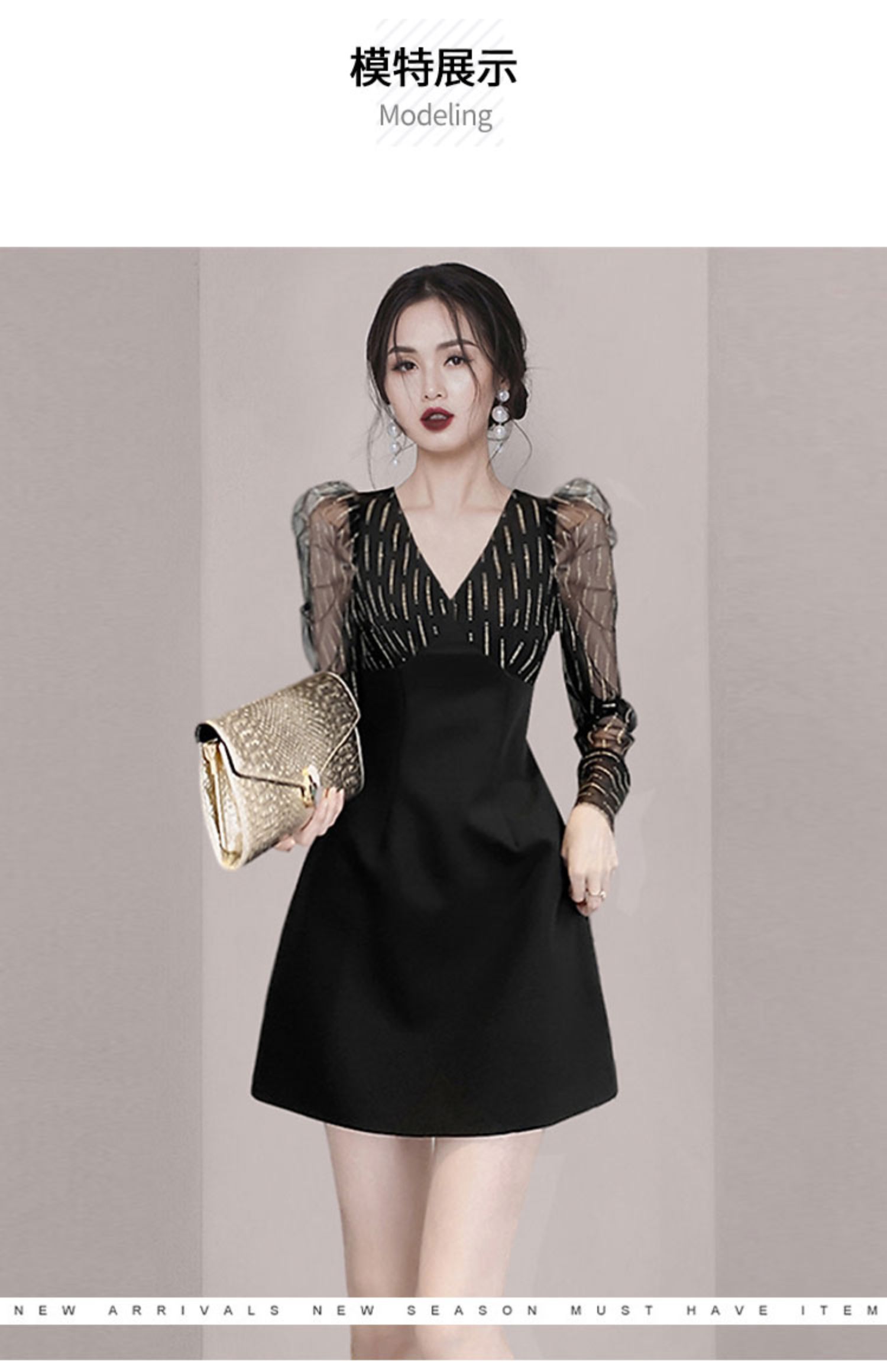 RM21613#法式赫本风气质高级感小黑裙2023年秋新款女装V领网纱拼接连衣裙