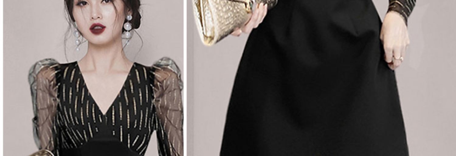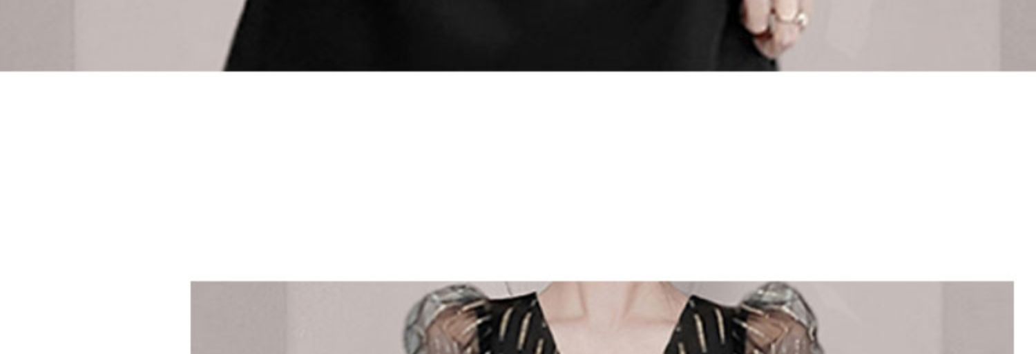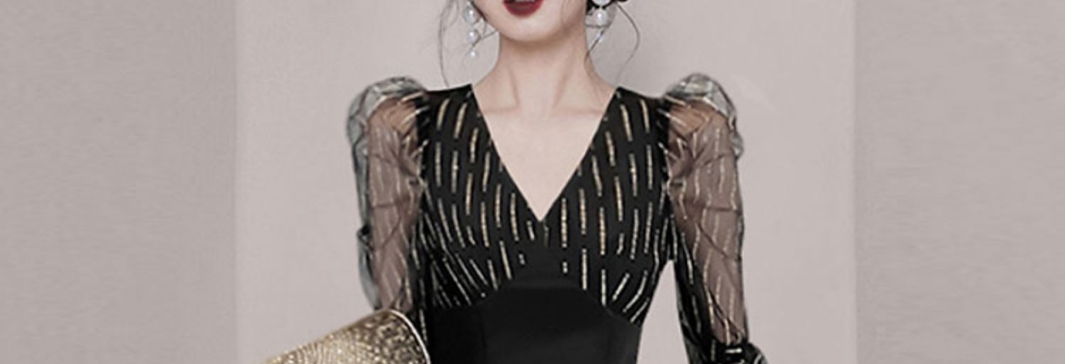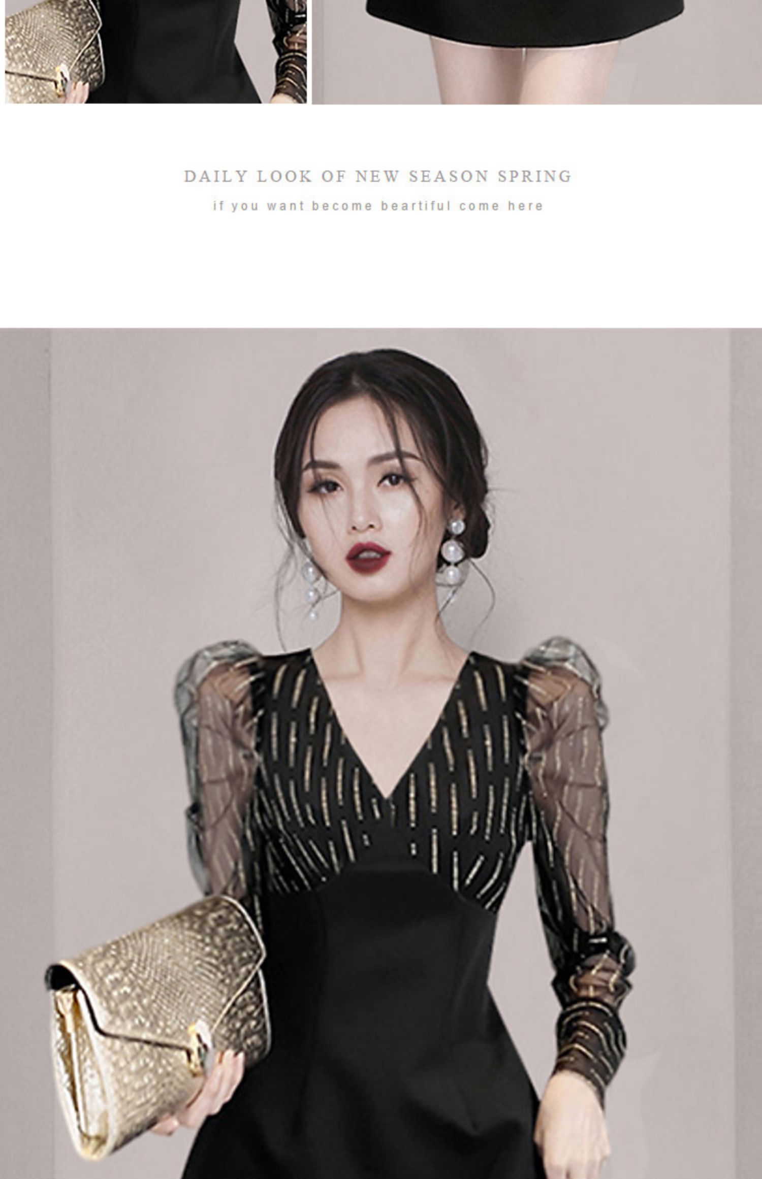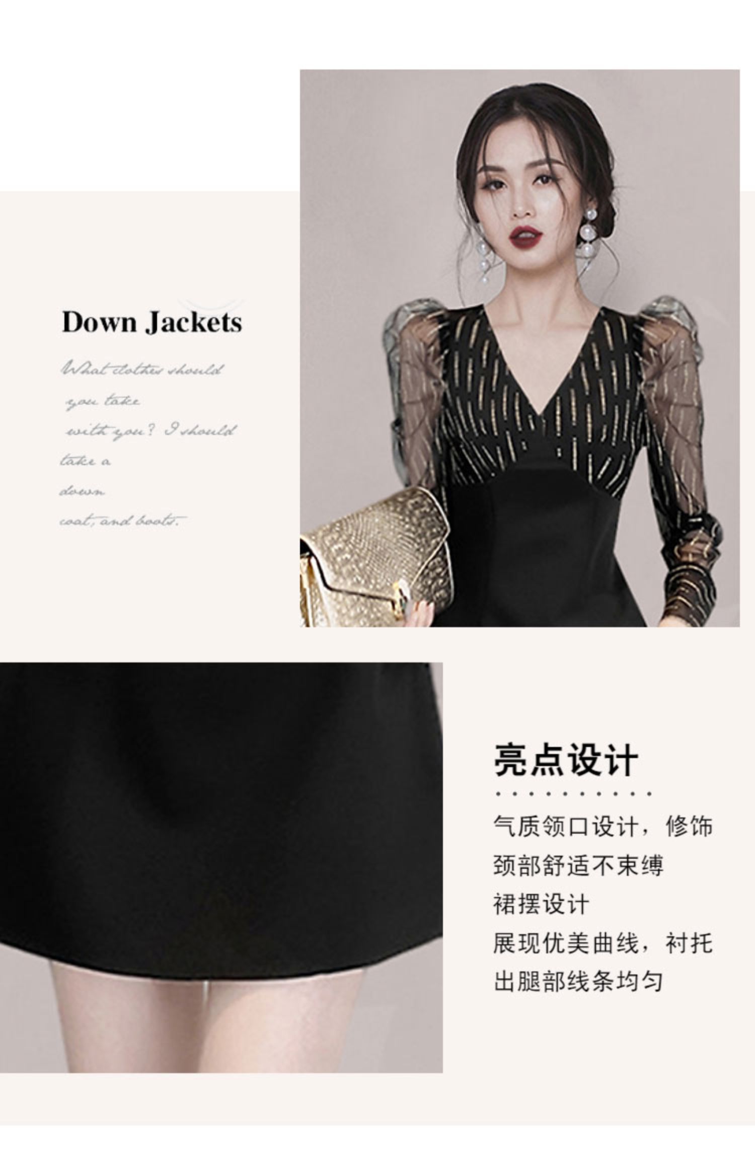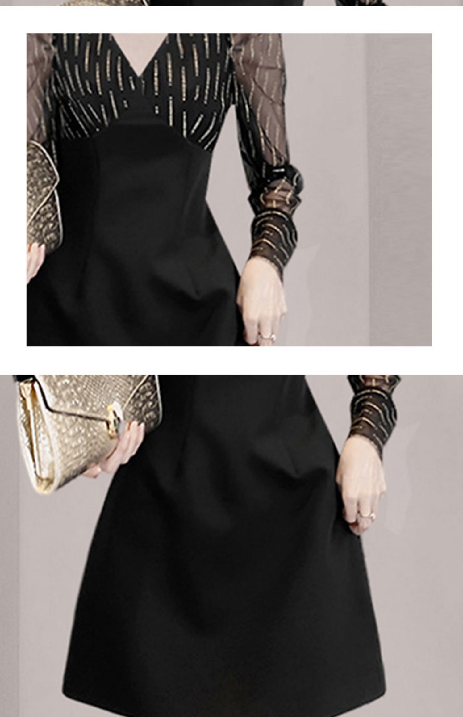 RM21613#法式赫本风气质高级感小黑裙2023年秋新款女装V领网纱拼接连衣裙