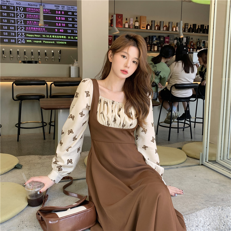 RM21651#高贵优雅气质长裙子复古撞色假两件蝴蝶高级感连衣裙女