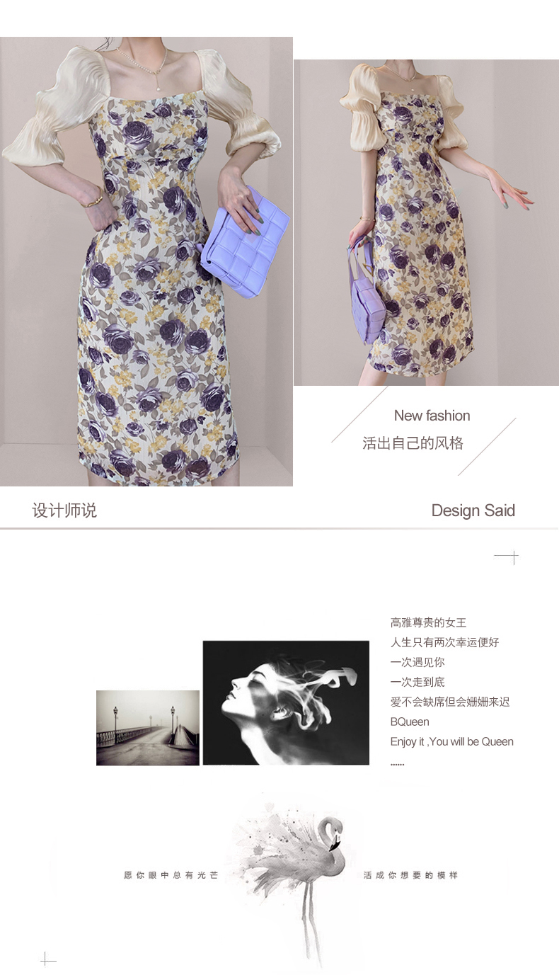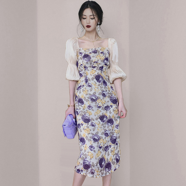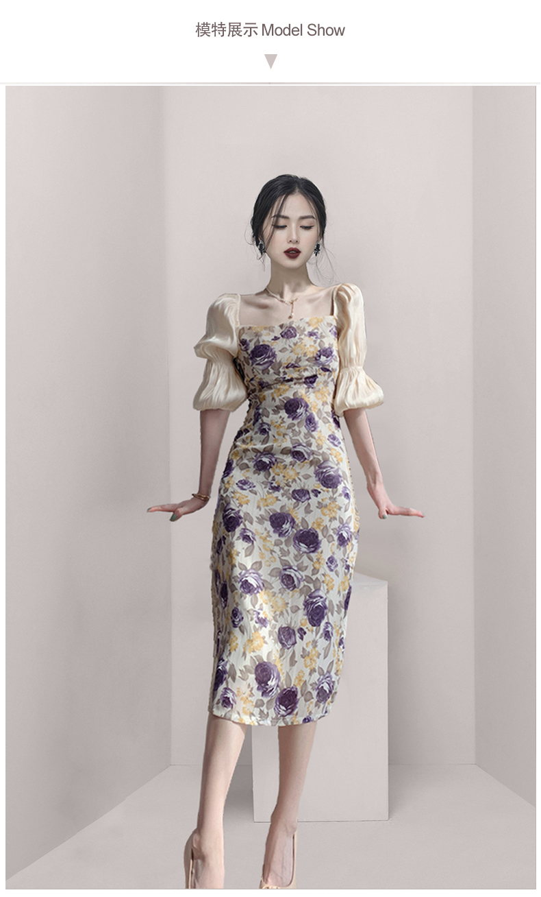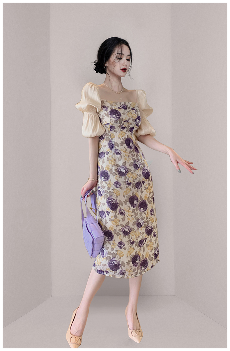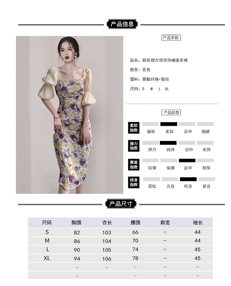 RM21787#夏装新款名媛碎花裙印花雪纺方领泡泡袖修身显瘦连衣裙子