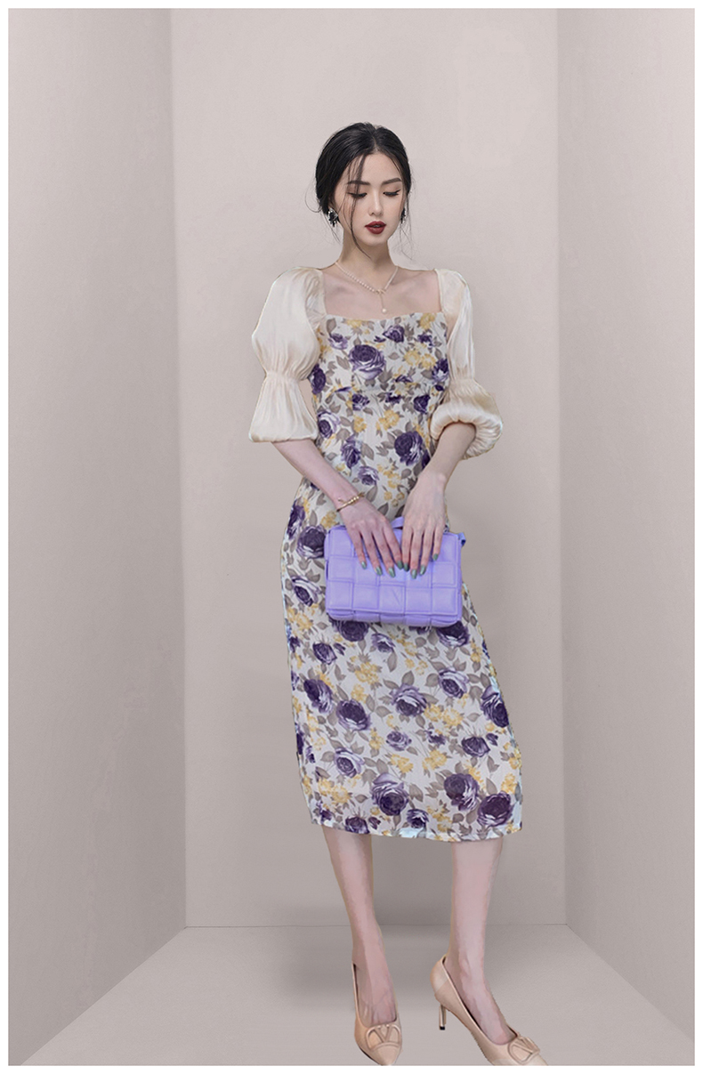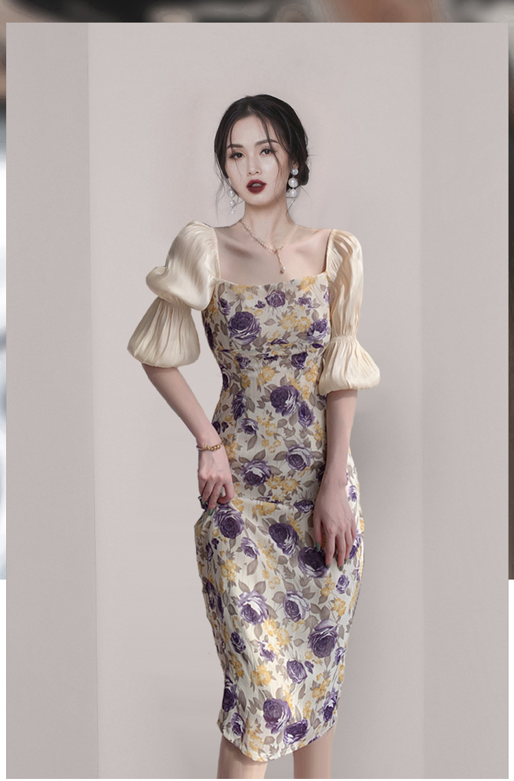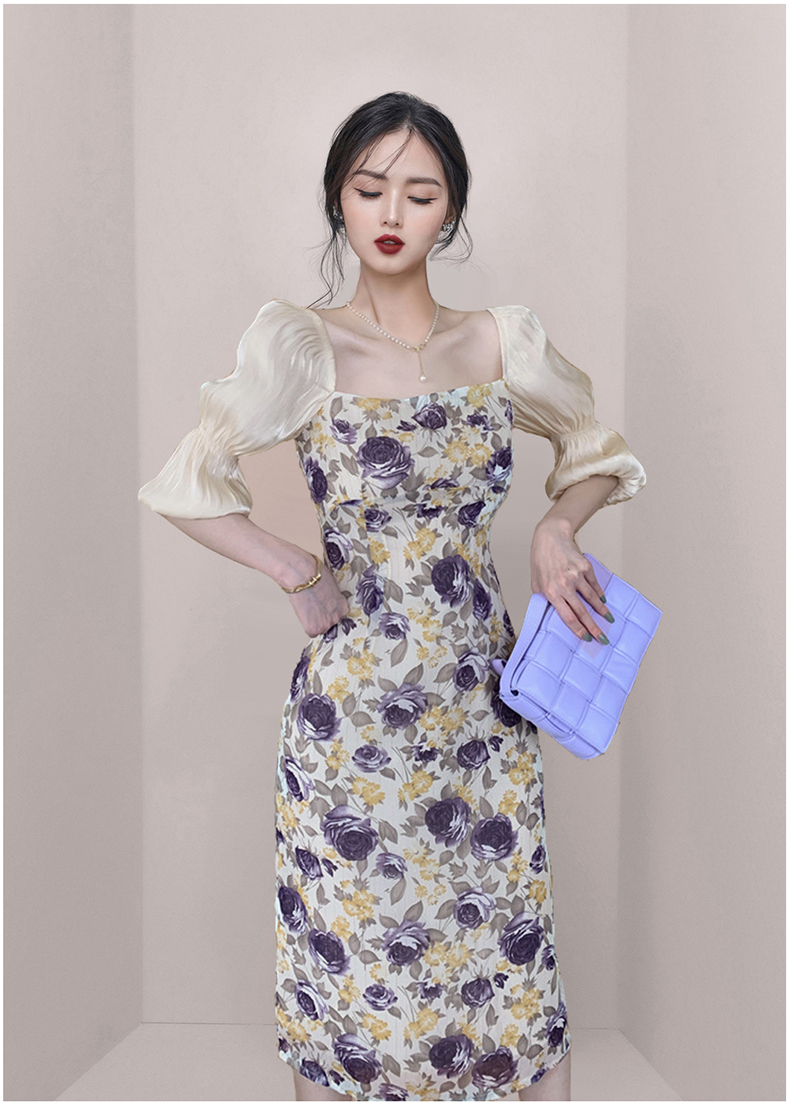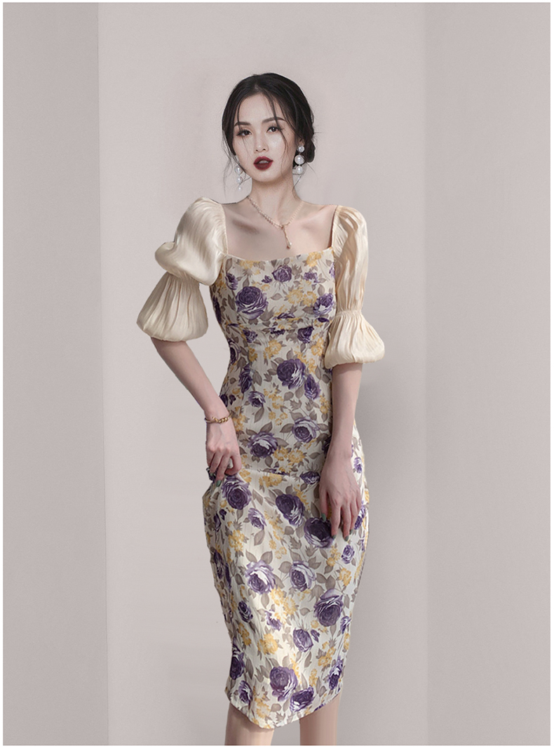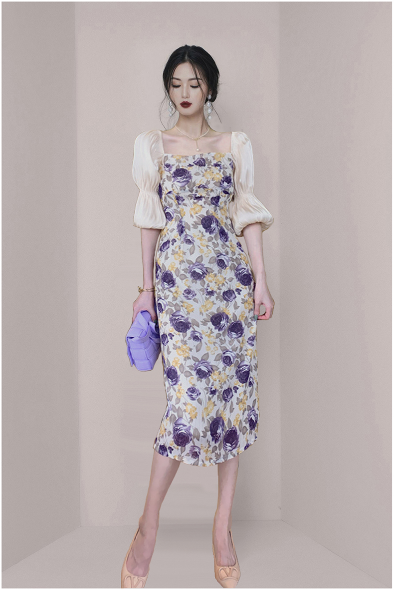 RM21787#夏装新款名媛碎花裙印花雪纺方领泡泡袖修身显瘦连衣裙子