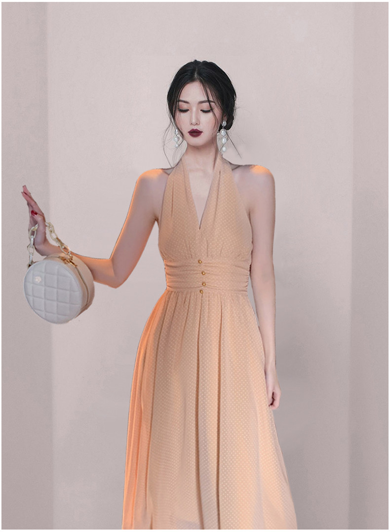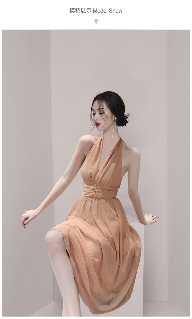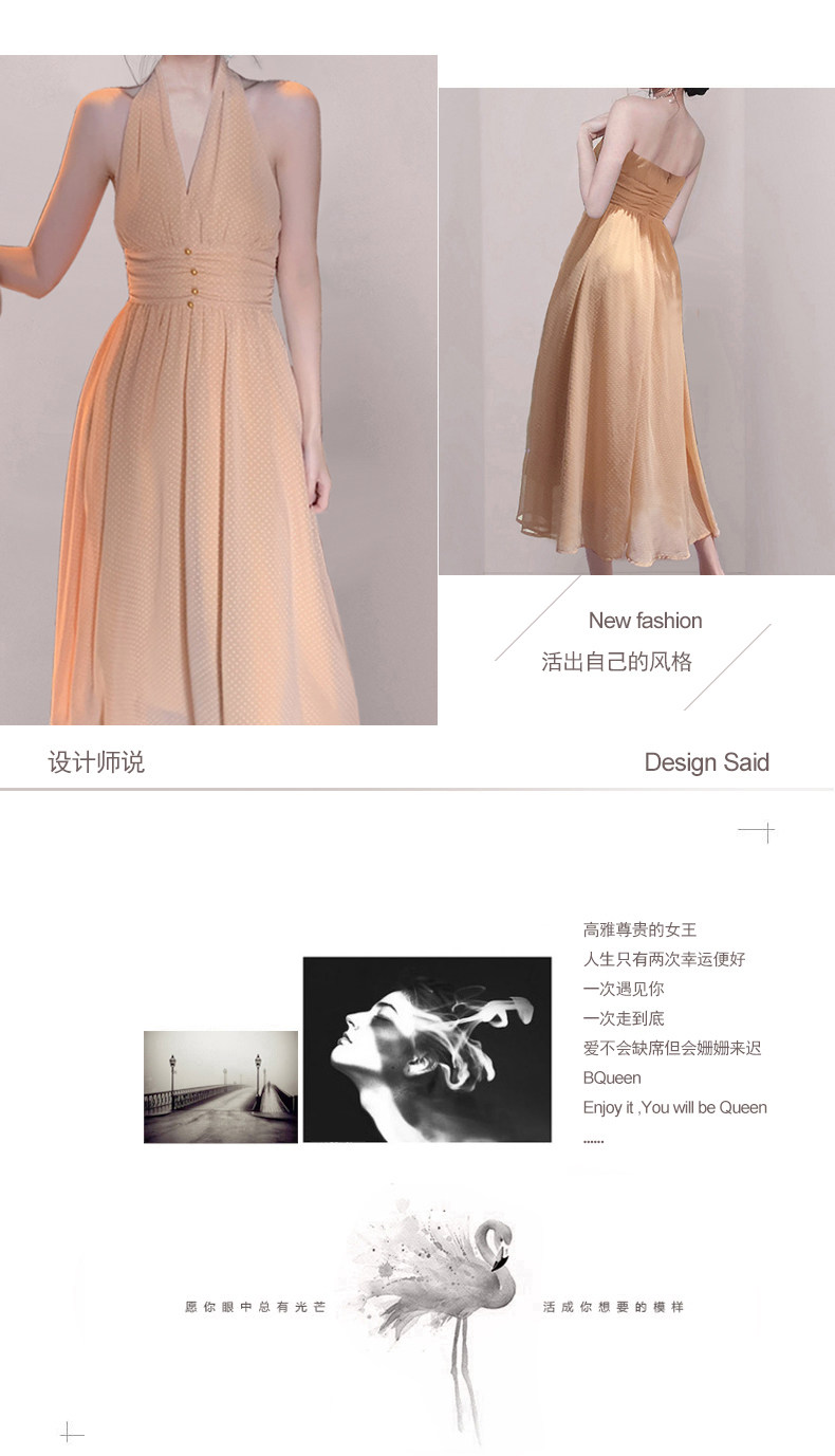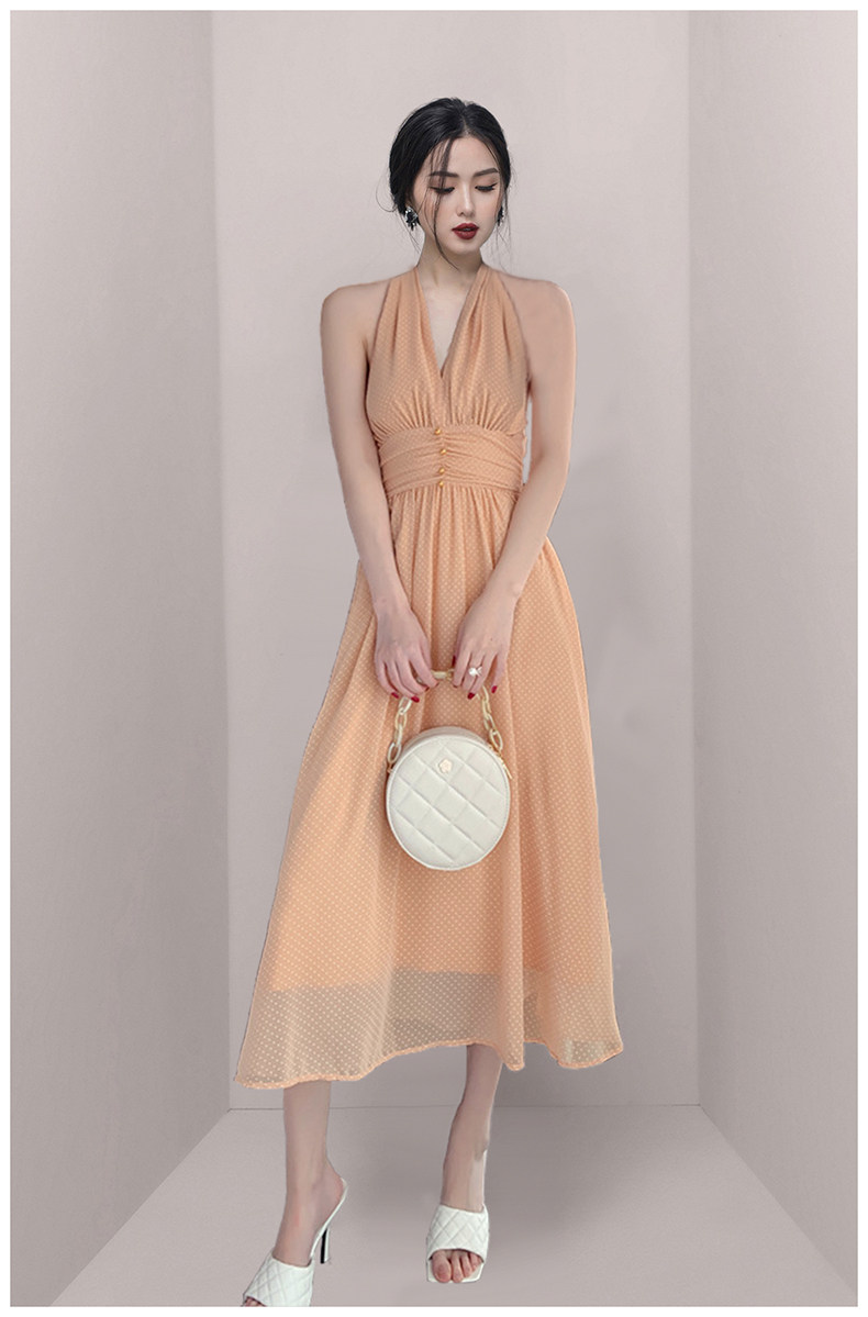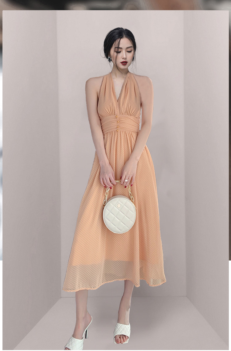 RM21792#夏装新款名媛女装度假风波点挂脖中长款连衣裙赫本风长裙