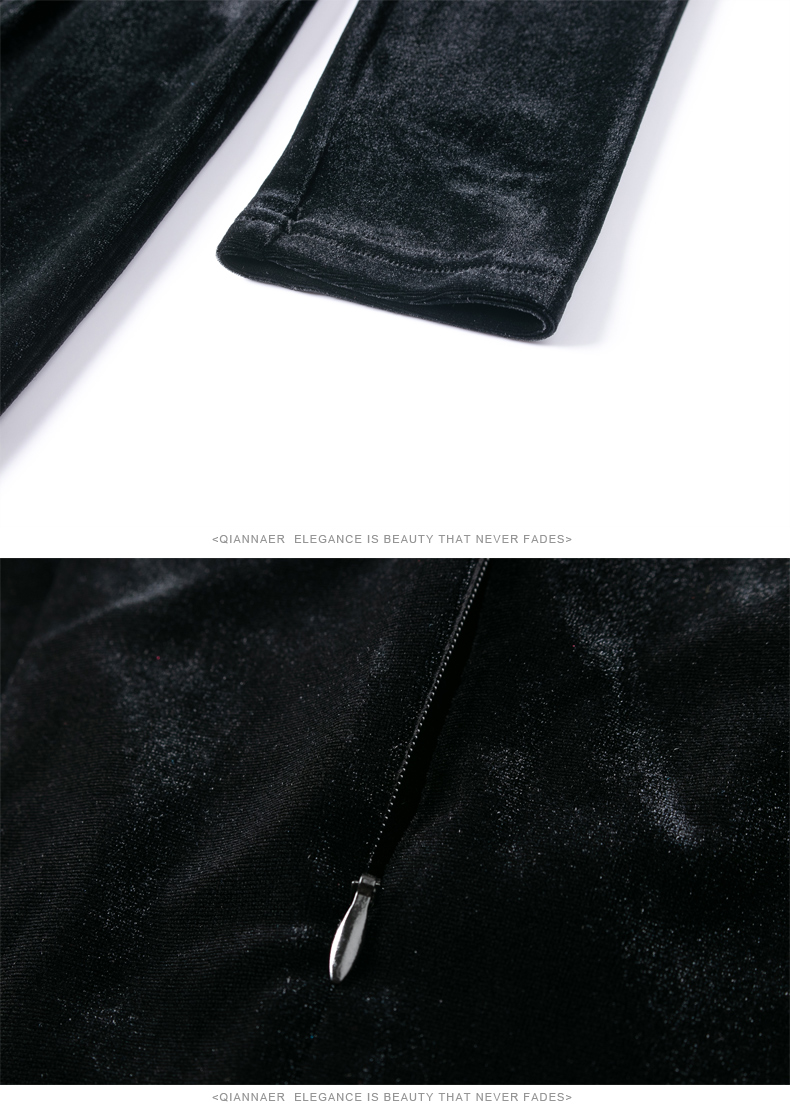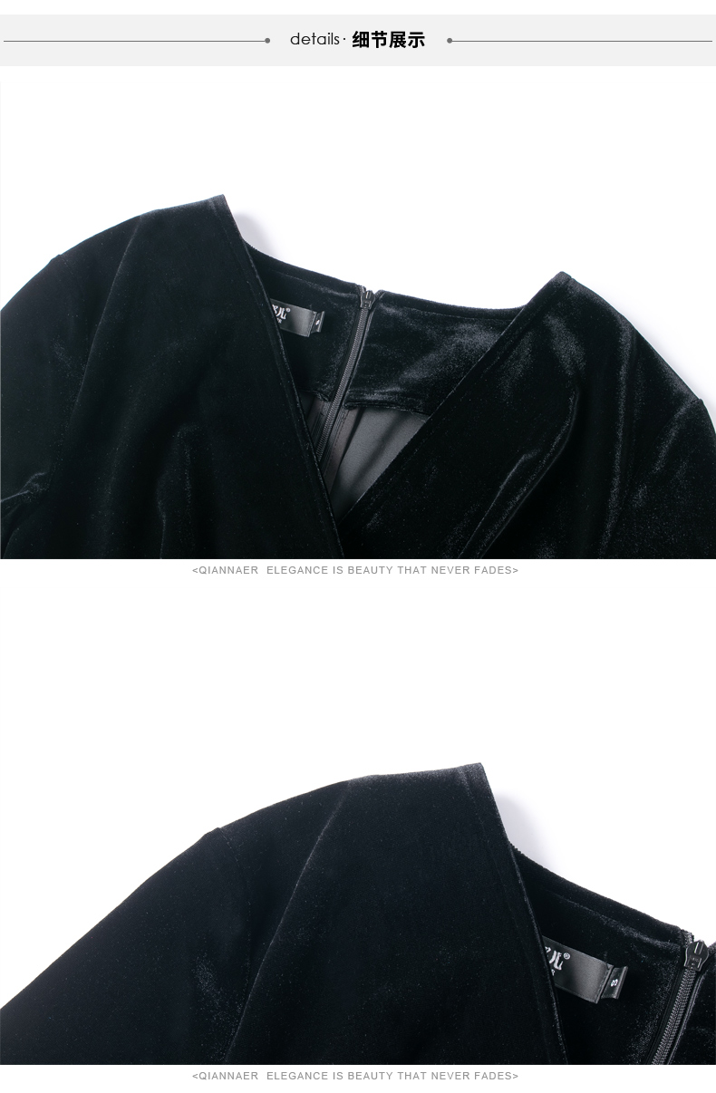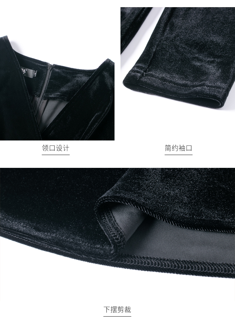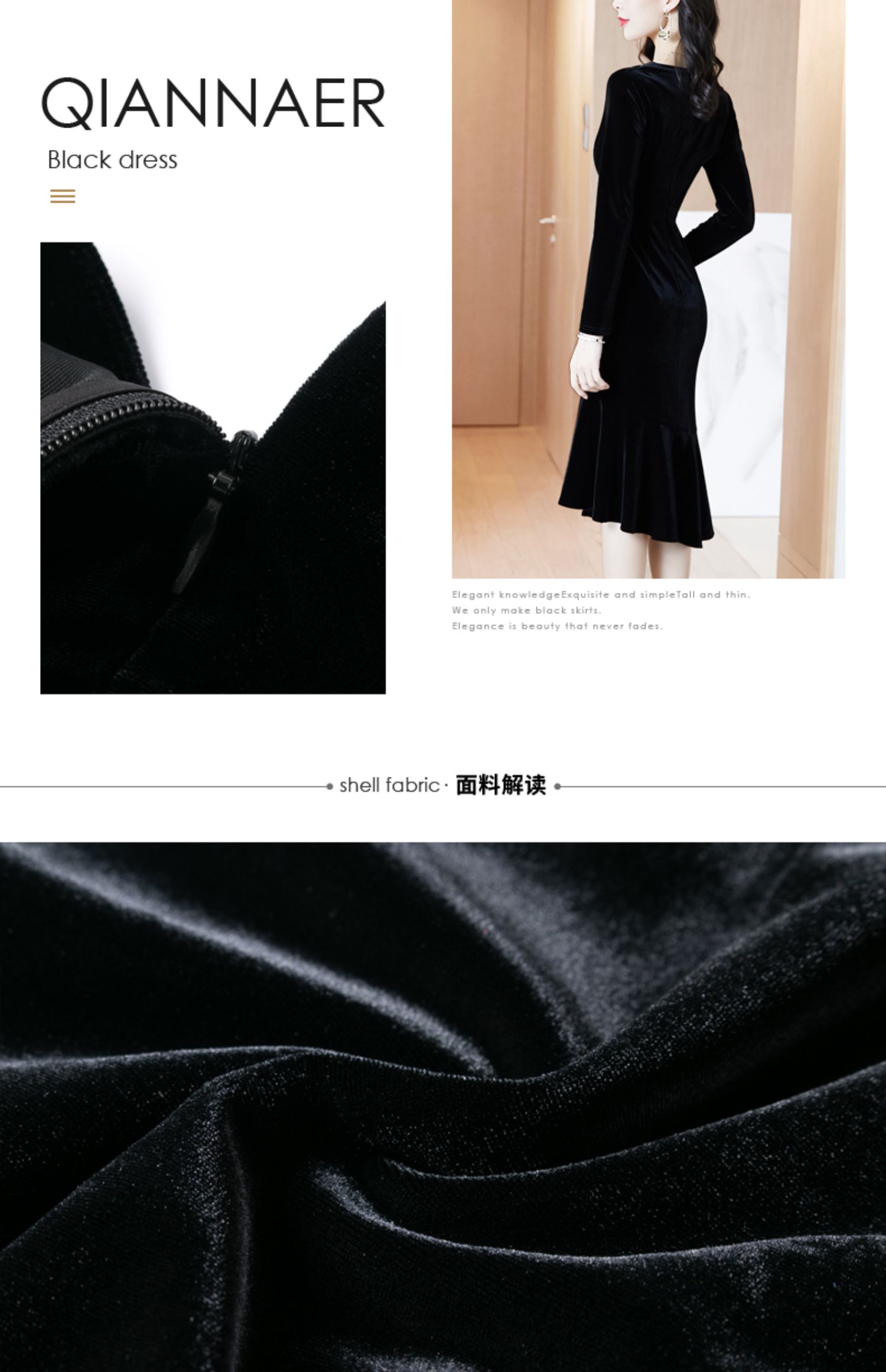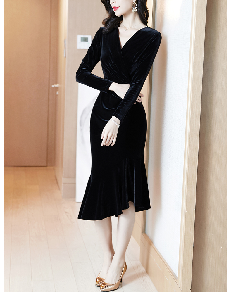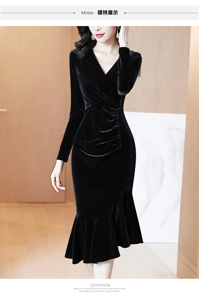 RM21840#金丝绒长裙连衣裙女2023新款春秋黑色深V领长袖显瘦气质鱼尾裙子